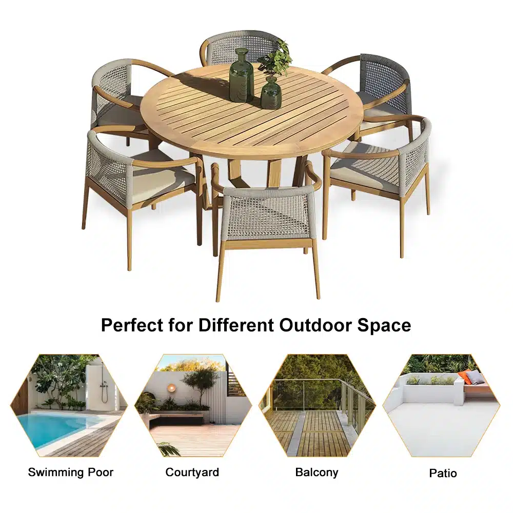 هل الطقم مناسب للاستخدام الخارجي طوال العام؟ نعم، بفضل خامات مقاومة للماء والشمس، الطقم مصمم ليتحمل مختلف الظروف الجوية.