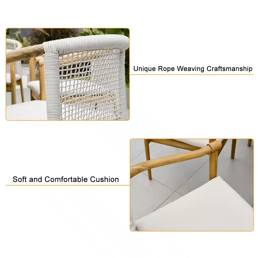 ما المواد المستخدمة في تصنيع الطقم؟ الطقم مصنوع من خشب العزيزي الطبيعي عالي الجودة مع ظهر كراسي من الخوص المقاوم للعوامل الجوية.