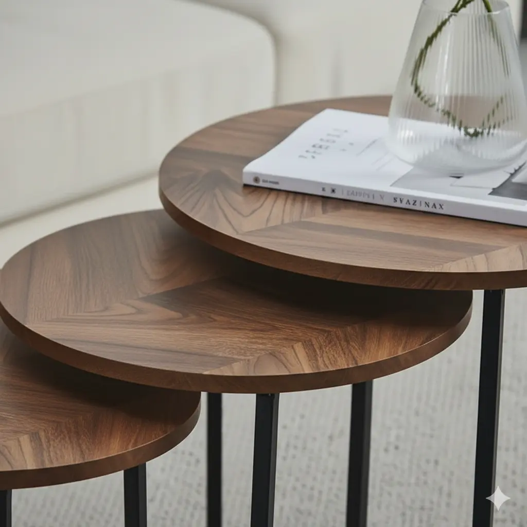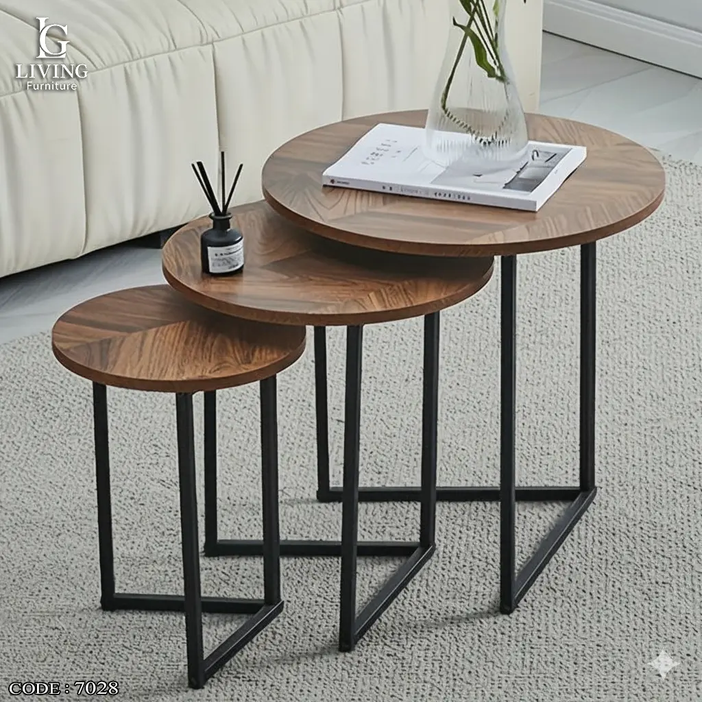 طقم سول طقم طاولات مودرن خشب طبيعي من Living يتميز بتصميم متداخل أنيق مكوّن من ثلاث طاولات مختلفة الأحجام، تضيف لمسة من الفخامة والبساطة إلى أي مساحة.