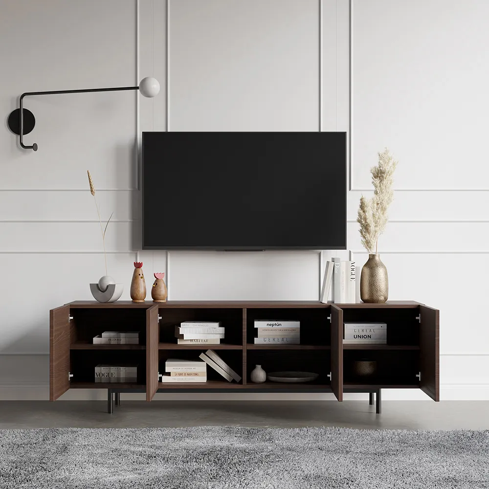تتميز وحدة التلفزيون سوناما بتصميم عصري مع أبواب ضلف مميزة تحتوي على شرائح خشبية رفيعة، مما يضيف لمسة جمالية رائعة لأثاث منزلك. مصنوعة من الخشب الطبيعي المقاوم للرطوبة، توفر هذه الوحدة مساحة كبيرة لتنظيم أغراضك وإزالة الفوضى، بالإضافة إلى تصميمها الذي يتناسب مع كافة الأنماط الحديثة. إنها قطعة مثالية لإضفاء لمسة من الأناقة والوظائف العملية في غرفة المعيشة. المقاس 180 سم عرض × 40 سم عمق × 55 سم ارتفاع