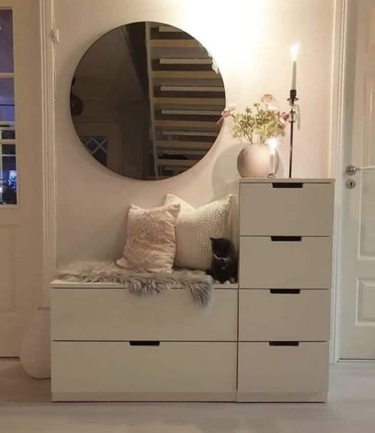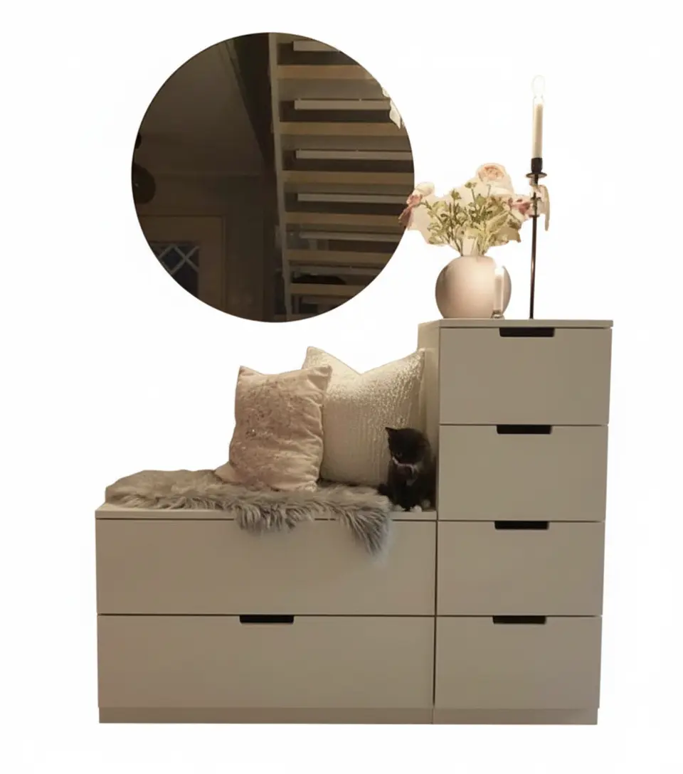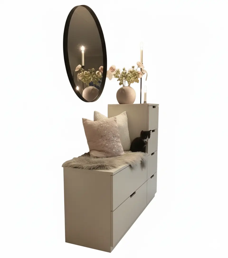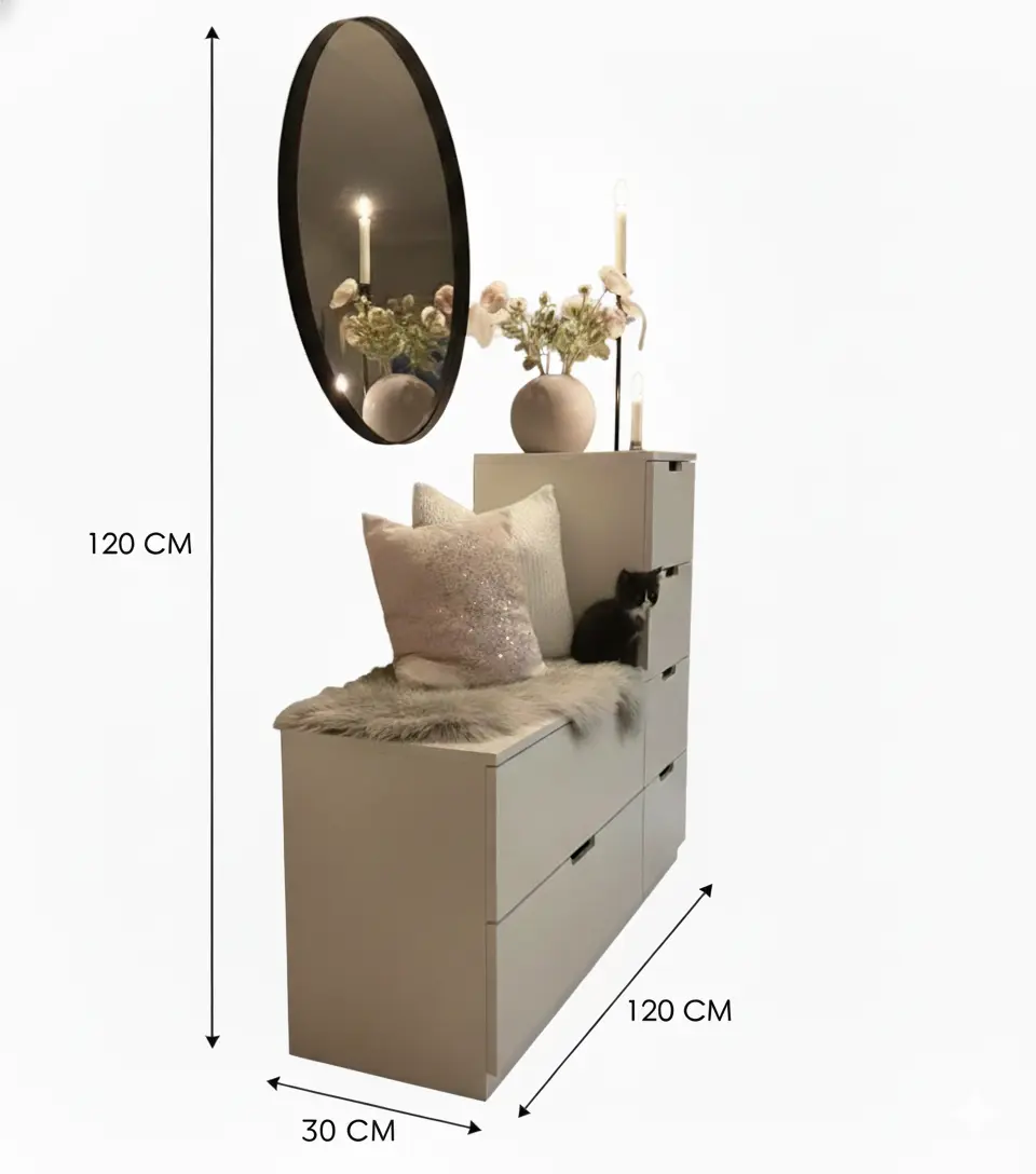 تصميم عملي وأنيق يجمع بين الجلوس المريح والتخزين الذكي، حيث تحتوي على أدراج متعددة لتخزين الأحذية والإكسسوارات، مع مساحة مخصصة للجلوس مريحة ومبطنة بوسائد ديكور أنيقة.