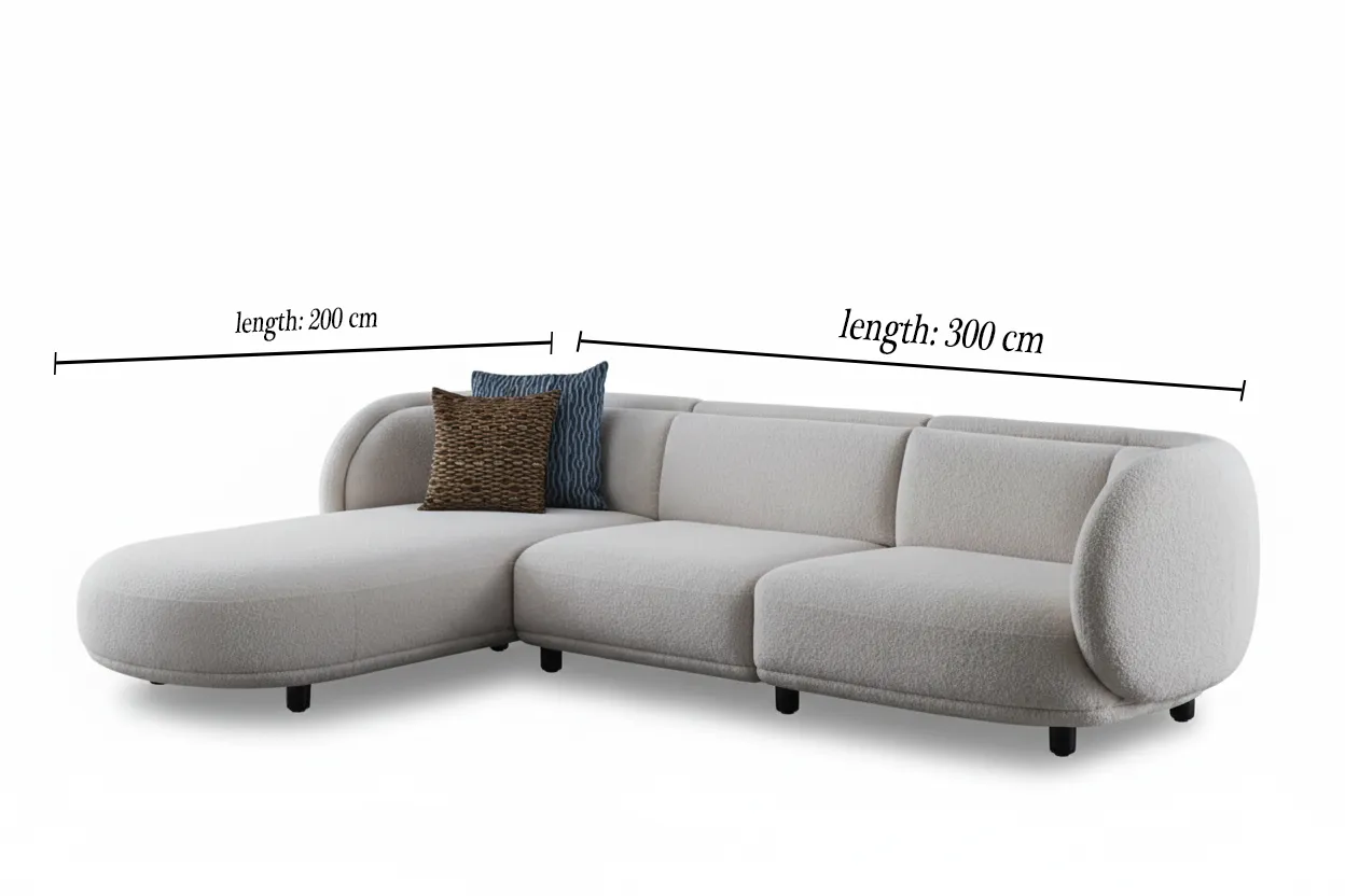 تتميز الركنة بعمق جلوس مريح، ودعامة ظهر مصممة لتوفير الدعم المثالي للجسم، بالإضافة إلى أريكة جانبية Chaise Longue تلائم لحظات الاسترخاء أو مشاهدة التلفاز. يمكن تغيير لون القماش حسب الطلب لتناسب ديكور الغرفة، كما أنها قابلة للتنفيذ بمقاسات مختلفة.