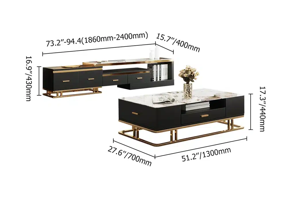 هل الطقم يشمل طاولة القهوة ووحدة التلفزيون؟ نعم، الطقم مكوّن من طاولة قهوة + وحدة تلفزيون بتصميم متناسق يمنح غرفة المعيشة طابعًا متناغمًا.