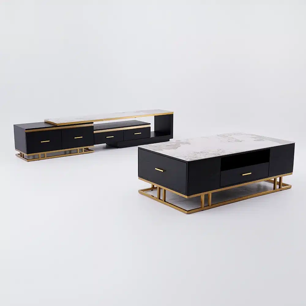 - طقم متكامل – يشمل طاولة قهوة وطاولة تلفزيون بتصميم متناغم.