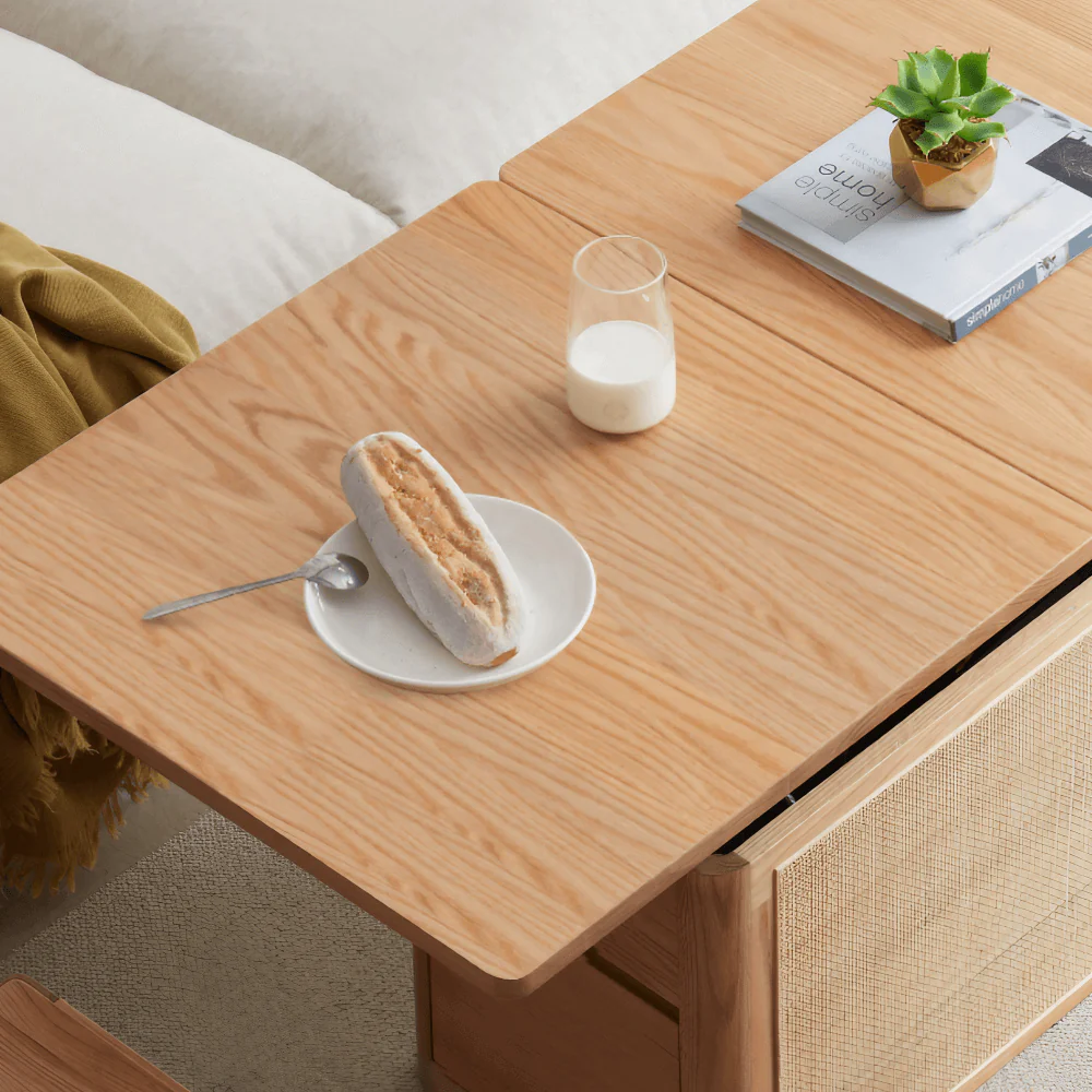 - تصميم أنيق وجميل: تم تصنيع الطاولة من الخشب الطبيعي عالي الجودة مع تفاصيل راتان لإضافة لمسة من الأناقة والتميّز. لون الخشب الطبيعي يجعلها تتناسب بسهولة مع أي ديكور موجود في منزلك سواء كان عصريًا أو كلاسيكيًا.