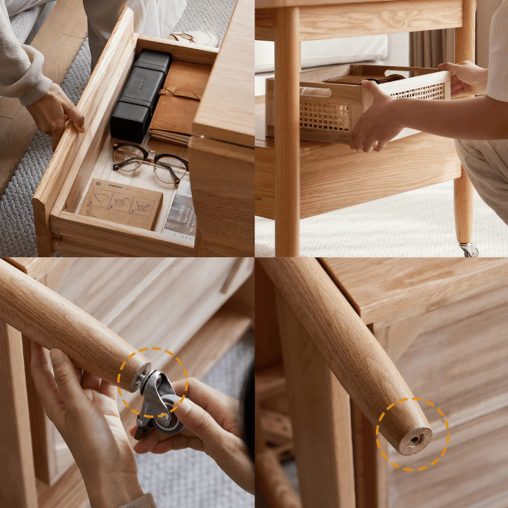- وظائف متعددة: تتمتع الطاولة بسطح أملس ومريح يمكنك استخدامه لوضع الأكواب أو الكتب، بالإضافة إلى رف ودرج للتخزين مما يساعد على الحفاظ على التنظيم في الغرفة.