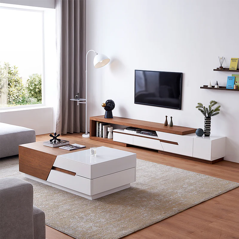 - طقم متكامل يضم وحدة تلفزيون وطاولة قهوة بتصميم متناغم.