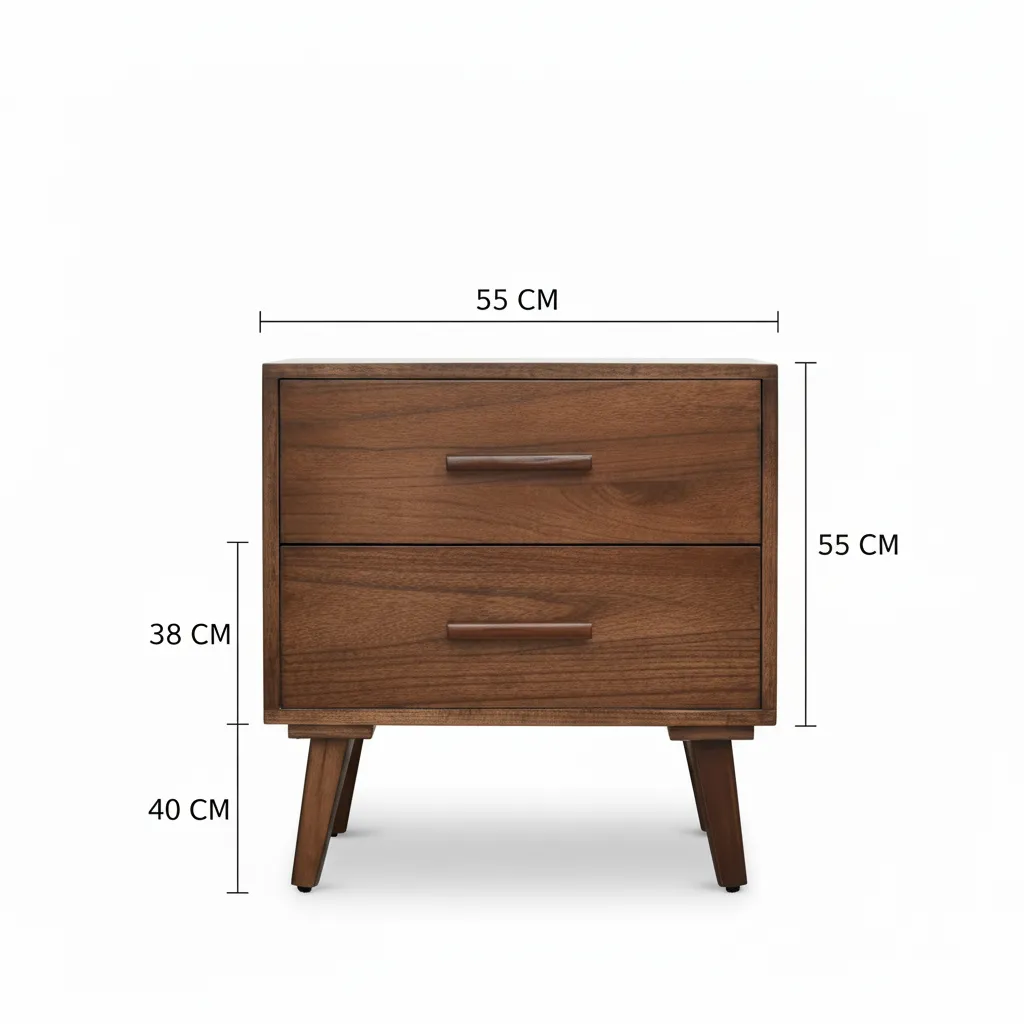 مصنوع من خشب طبيعي عالي الجودة يمنحك مظهرًا دافئًا وقويًا في نفس الوقت، بتصميم بسيط يجمع بين العملية والجمال. يتميز بوجود درجين واسعَين لتخزين الأغراض الشخصية مثل الكتب، الإكسسوارات أو أدوات ما قبل النوم، مما يجعله الاختيار المثالي بجوار السرير.