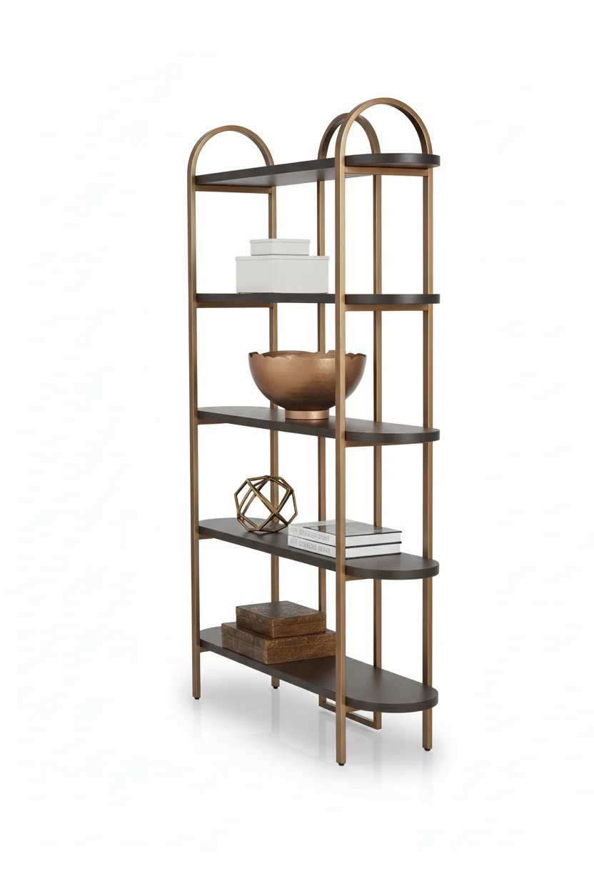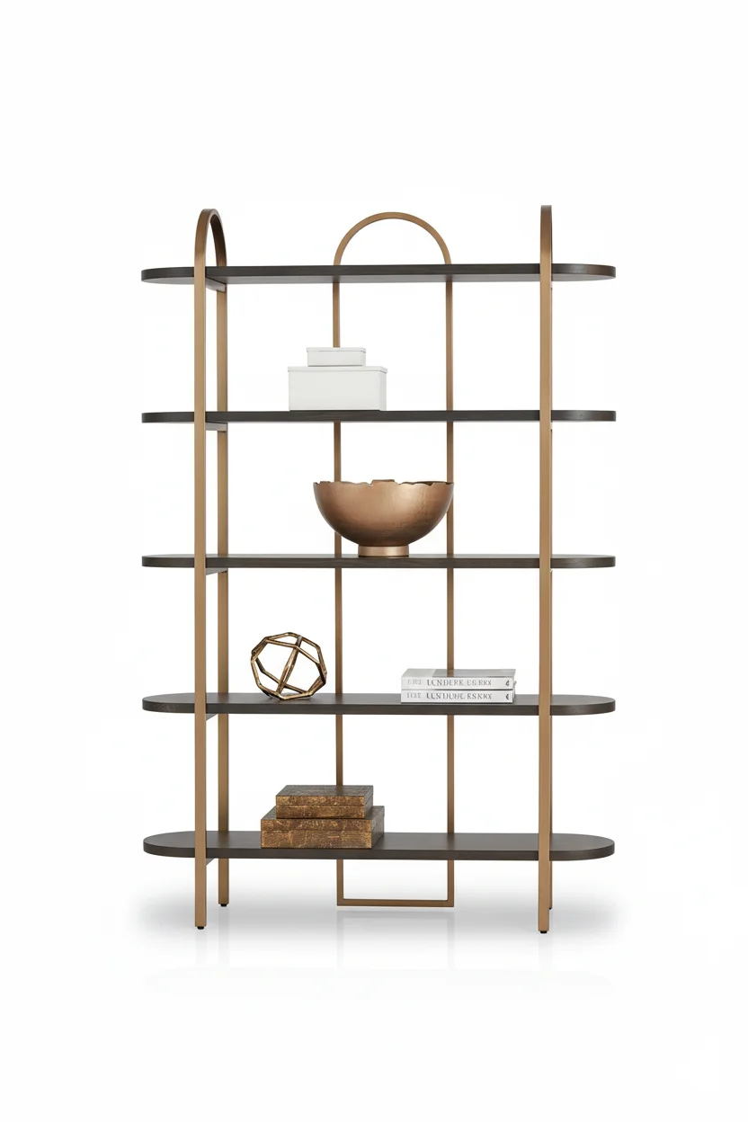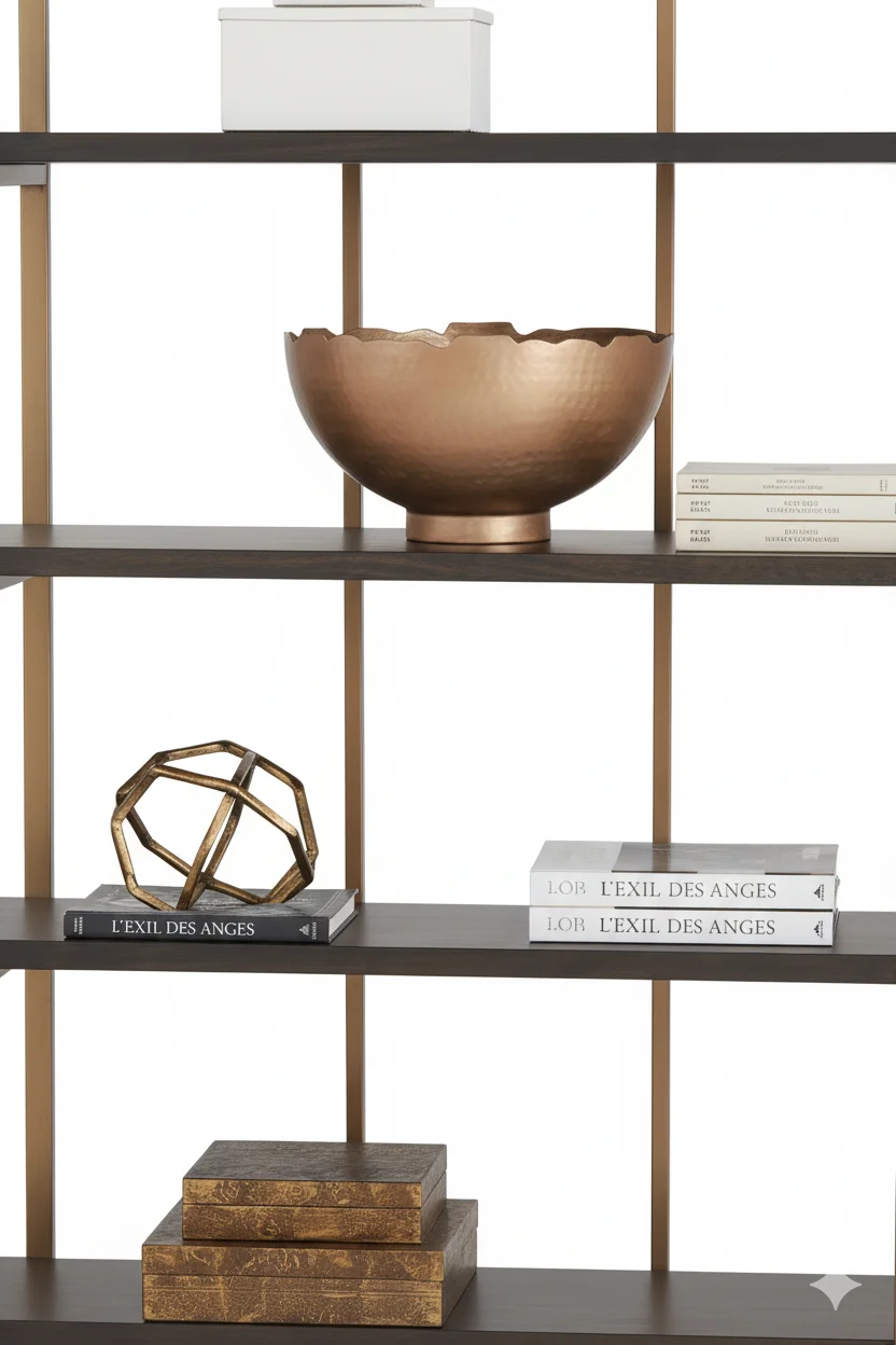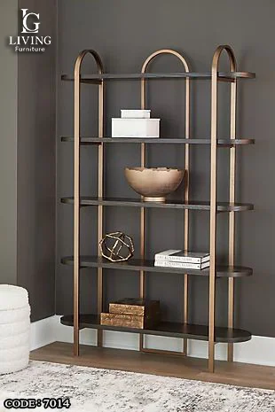 تم تصميمها بإطار معدني مطلي باللون الذهبي يمنحها مظهراً راقياً، مع أرفف خشبية قوية تتيح مساحة مثالية لعرض الكتب، التحف، والإكسسوارات.