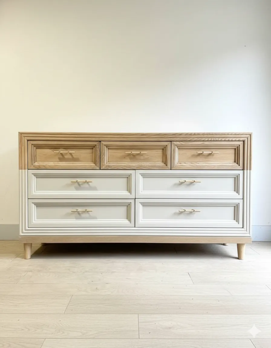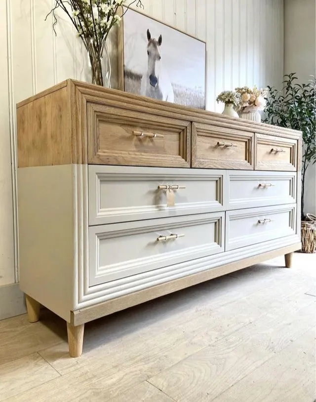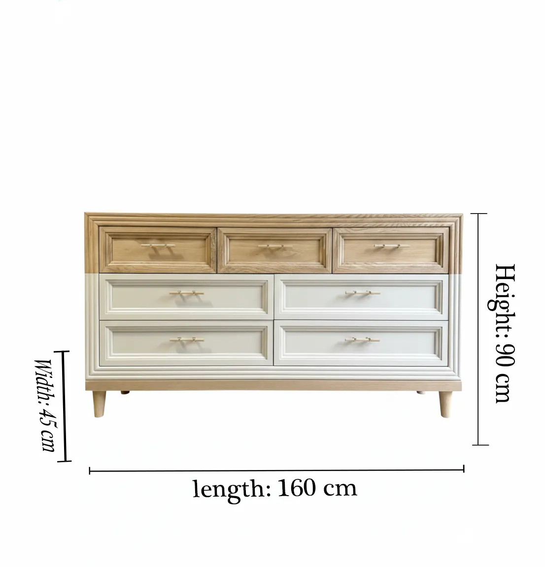 فلوركس وحدة تخزين أدراج بتصميم مودرن كلاسيكتجمع بين الأبيض والخشب الطبيعي، بتصميم عملي و6 أدراج واسعة لتنظيم مثالي.الأبعاد: الطول 160 سم × الارتفاع 90 سم × العمق 45 سم