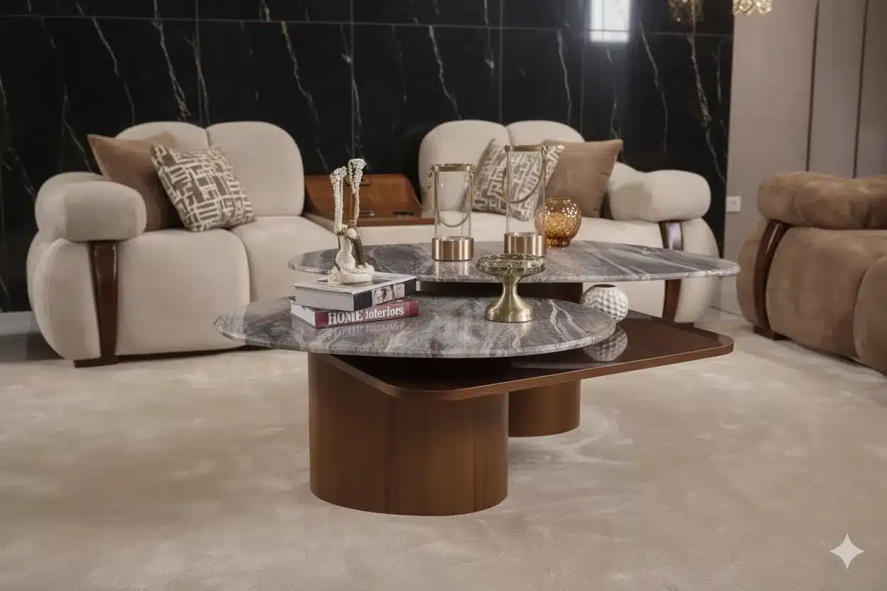 الساقان وتفاصيل الجوانب مدعّمة بعناصر خشبية قوية تمنح القطعة ثباتًا ومظهرًا مميزًا، بينما يتوسط المجموعة طاولة مودرن بسطح رخامي متعدد المستويات لتجربة استخدام عملية وأنيقة.