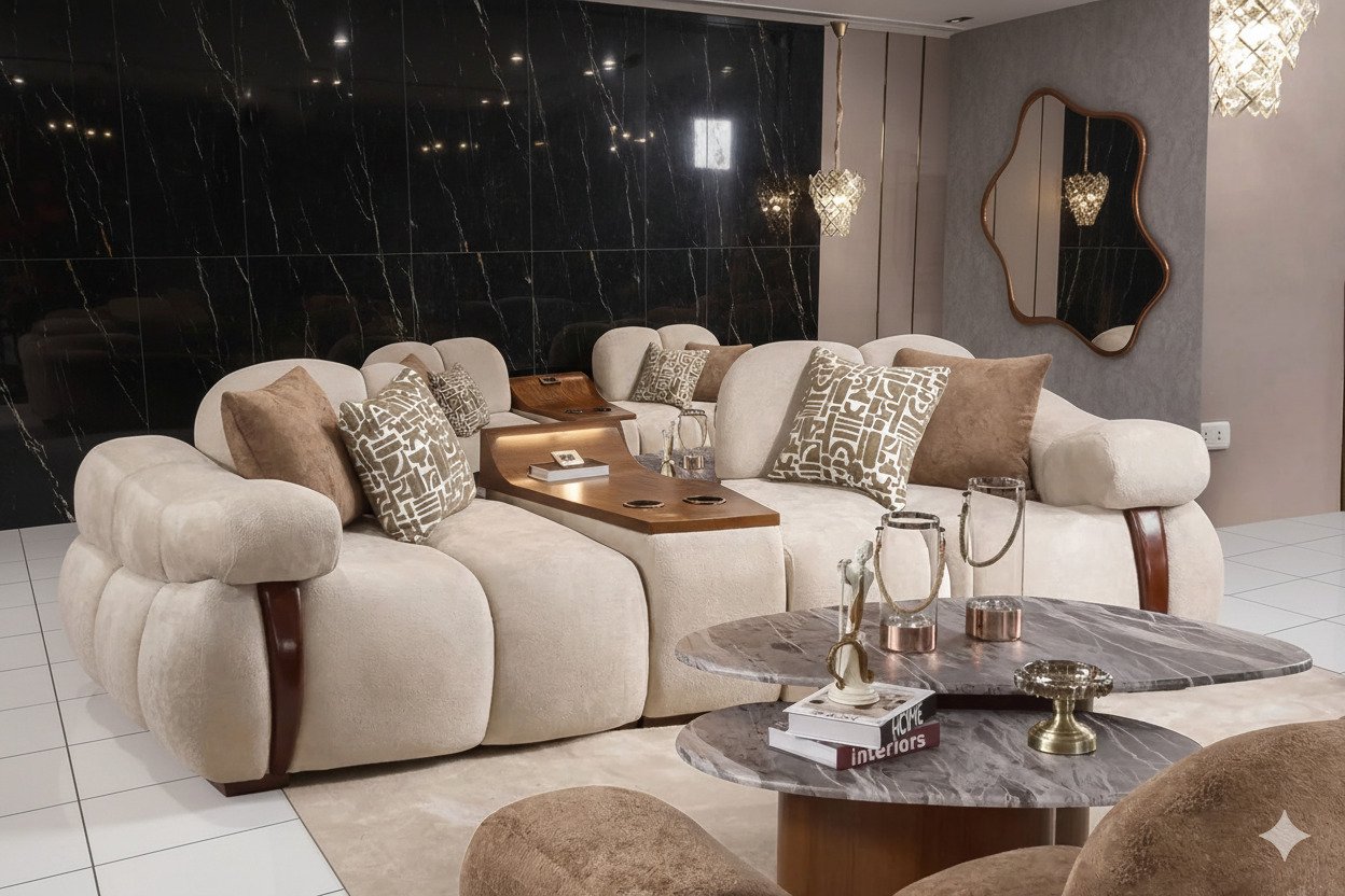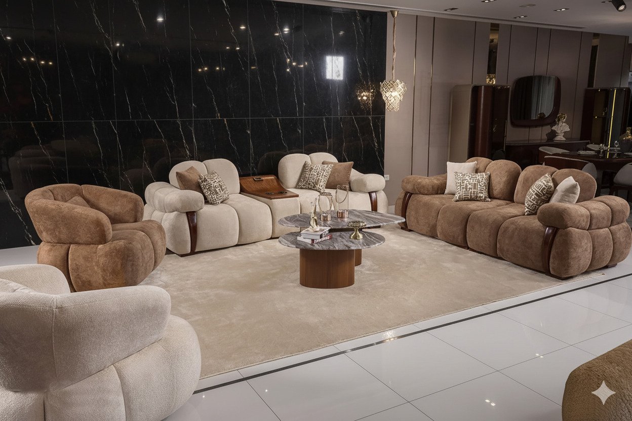 يعتمد التصميم على مجموعة جلسات منفصلة ذات خطوط دائرية فاخرة وقماش مخملي ناعم بلون بيچ/بني دافئ يضيف إحساس الراحة والدفء للمكان.