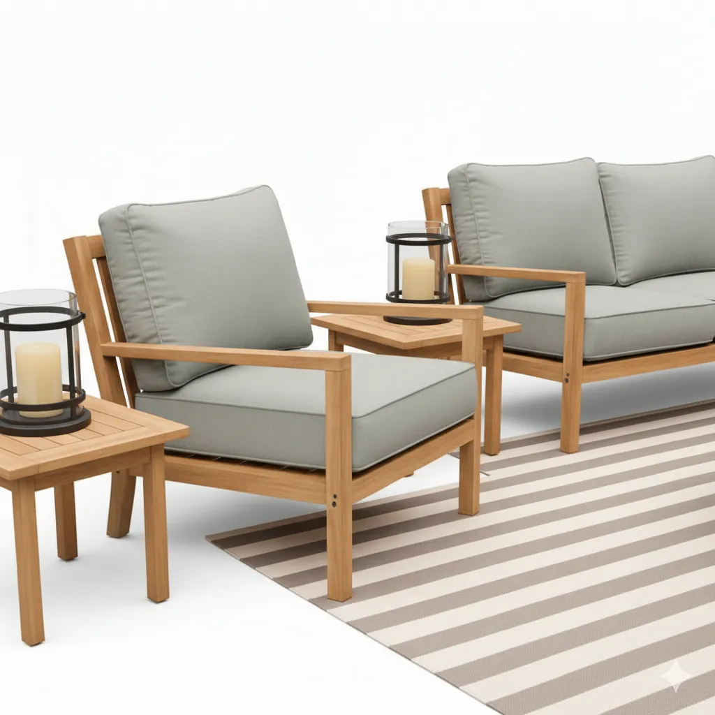 بتصميم عصري يجمع بين البساطة والفخامة، مصنوع من خشب طبيعي متين يتحمل الشمس والرطوبة، ومزوّد بوسائد رمادية ناعمة مقاومة للماء وسهلة التنظيف.