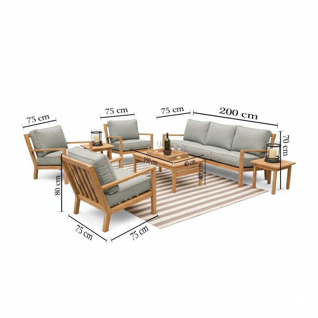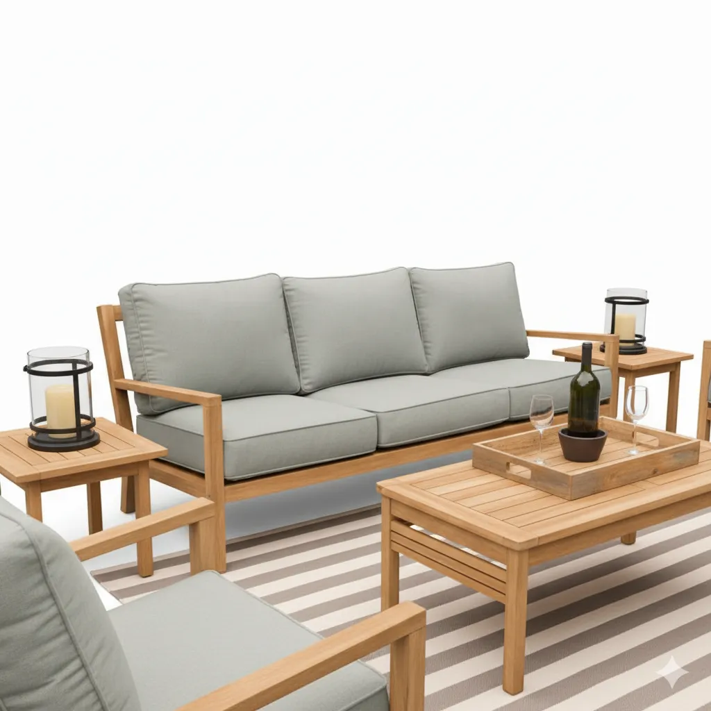 فيستا طقم جلوس خارجي أنيق ومتين مكوَّن من 5 قطع (كنبة ثلاثية + 2 كرسي + طاولة قهوة + طاولة جانبية).مصنوع من خشب طبيعي مقاوم للعوامل الجوية مع وسائد رمادية فاخرة تضيف لمسة من الراحة والفخامة لمساحتك