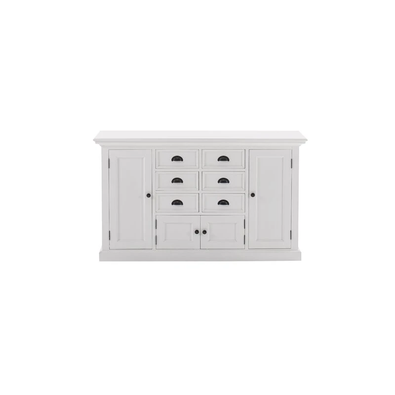 • تحتوي على ست أدراج، خزانة ببابين ، وخزانتين جانبيتين مع أرفف داخلية تشكل القاعدة.