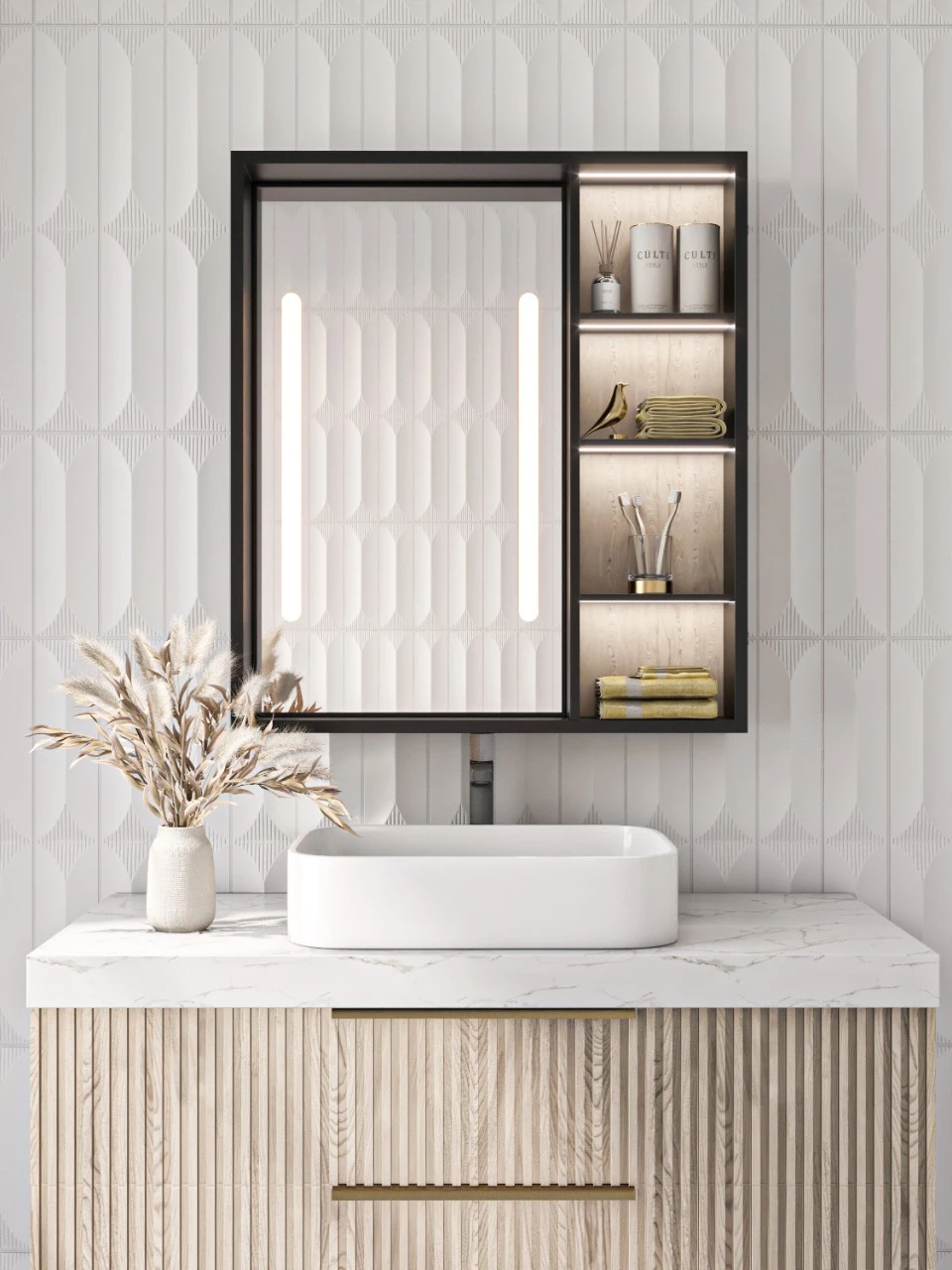 إذا كنت تبحث عن تصميم عصري و عملي لتحسين ديكور حمامك وتنظيم مستلزماتك، فإن وحدة مرايا حمام كافينا هي الخيار المثالي. هذه الوحدة تجمع بين الجمال و الوظيفية بفضل إضاءة ليد الداخلية و الأرفف الجانبية العملية، مما يجعل الوصول إلى أغراضك أسهل وأسرع.