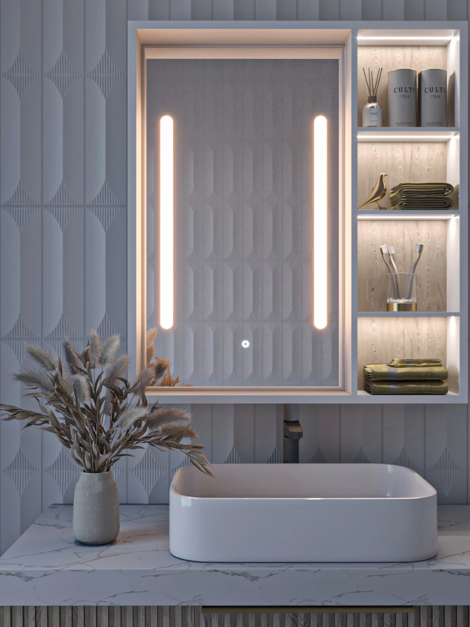 أضف لمسة فريدة من الأناقة والوظيفة إلى حمامك مع وحدة مرايا حمام كافينا – الخيار الذكي لمن يبحث عن مرايا ليد للحمام بتصميم عصري ومتكامل. مثالية للحمامات الصغيرة، حيث توفر إضاءة داخلية دافئة وأرفف عملية لتنظيم مستلزماتك اليومية بكل سهولة.