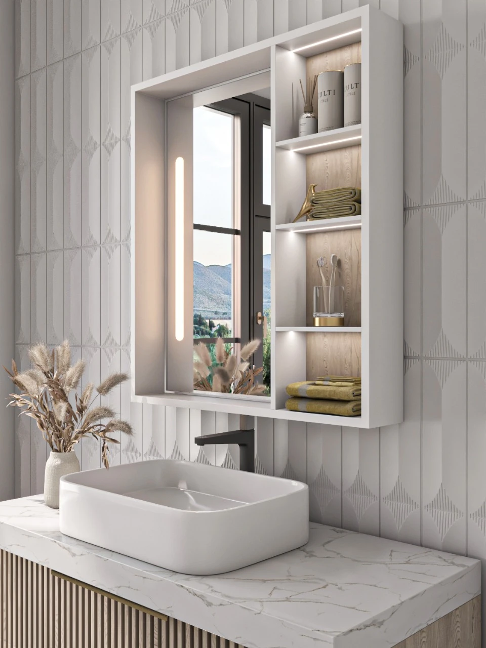 - أرفف مفتوحة على مستوى البصر سهولة الوصول وسرعة الاستخدام، مثالية لتخزين مستحضرات العناية والمناشف. تناسبك إذا كنت تبحث عن مرايا مغاسل حمامات عملية أو مرايات حمامات مودرن.
