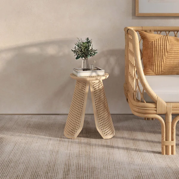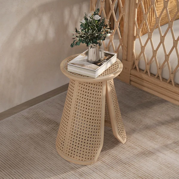 أضف لمسة من الطبيعة والراحة إلى منزلك مع طاولة كاڤي الجانبية المصممة من الروطان والخشب الطبيعي. تتميز هذه الطاولة بتصميمها المجوف و الدائري مع قاعدة ذات أرجل ثلاثية القوائم، مما يجعلها قطعة عملية وأنيقة تتناغم بشكل رائع مع أي ديكور منزلي.