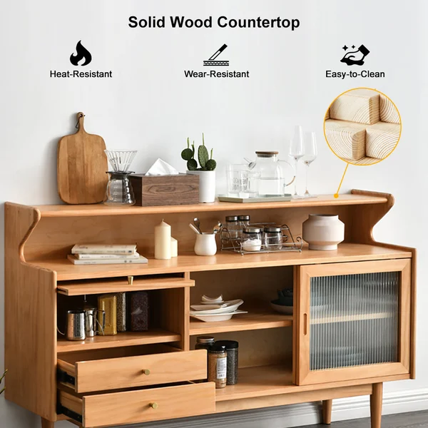 أضف تصميمًا من الحواف الأنيقة والمستديرة والقفص مع نغمة طبيعية مميزة، ويوفر هذا البوفيه توازنًا مثاليًا بين الطابع الحديث البسيط وراحة المطبخ ويضفي سحر الشمال. تتميز بباب واحد قابل للطي، وبابين زجاجيين منزلقين للكشف عن رف واحد ودرجين، ويمكن أن تكون مثالية لتخزين بياضات الطعام والأطباق ومجموعة أدوات المطبخ الأخرى.
