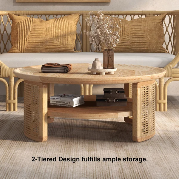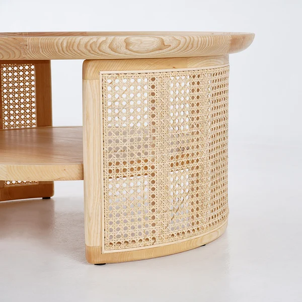 - مزيج من الخشب والراتان: يعزز اللون الطبيعي للخشب مع شقوق الراتان المدمجة في التصميم، مما يضيف لمسة من الطبيعة ويجعل الطاولة جزءًا لا يتجزأ من الديكور العام لمساحة المعيشة الخاصة بك.