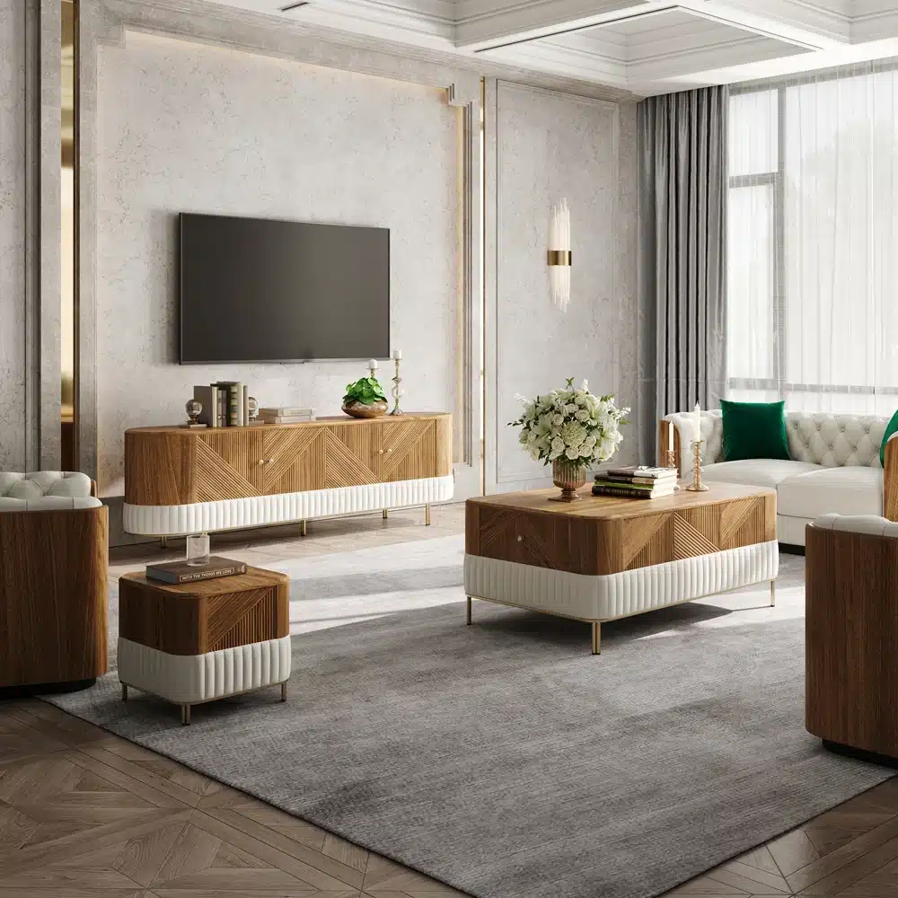 - طقم متكامل – يشمل طاولة قهوة، طاولة جانبية، وطاولة تلفزيون لمظهر متناسق ومتوازن.