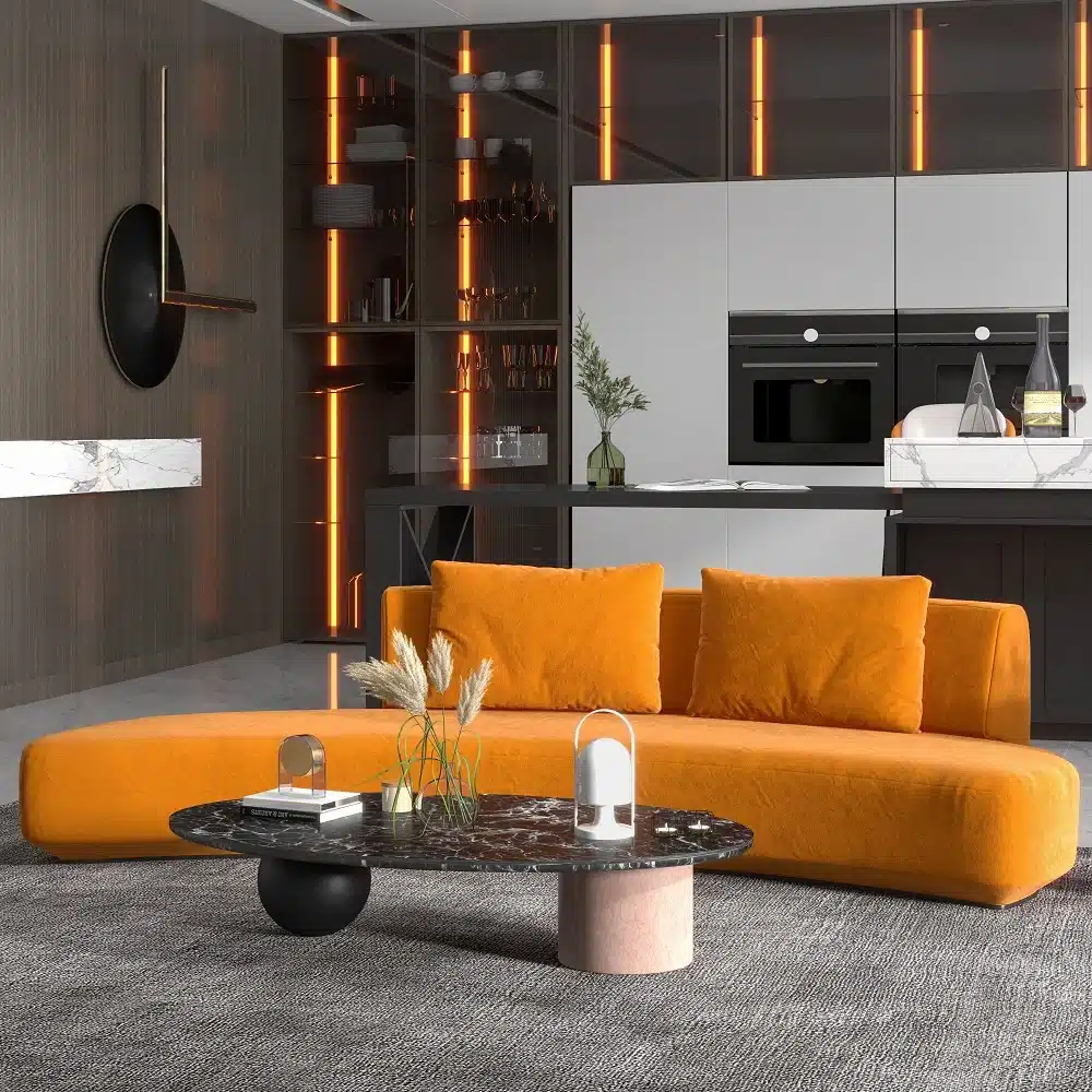 أضف لمسة من الأناقة الجريئة والطاقة المشرقة إلى منزلك مع هذه الكنبة العصرية المصنوعة من القماش المخملي الفاخر باللون البرتقالي الزاهي. لونها الدافئ يمنح الغرفة إشراقة وحيوية، ليجعلها قطعة محورية تلفت الأنظار وتضفي أجواءً مفعمة بالدفء والترحيب.