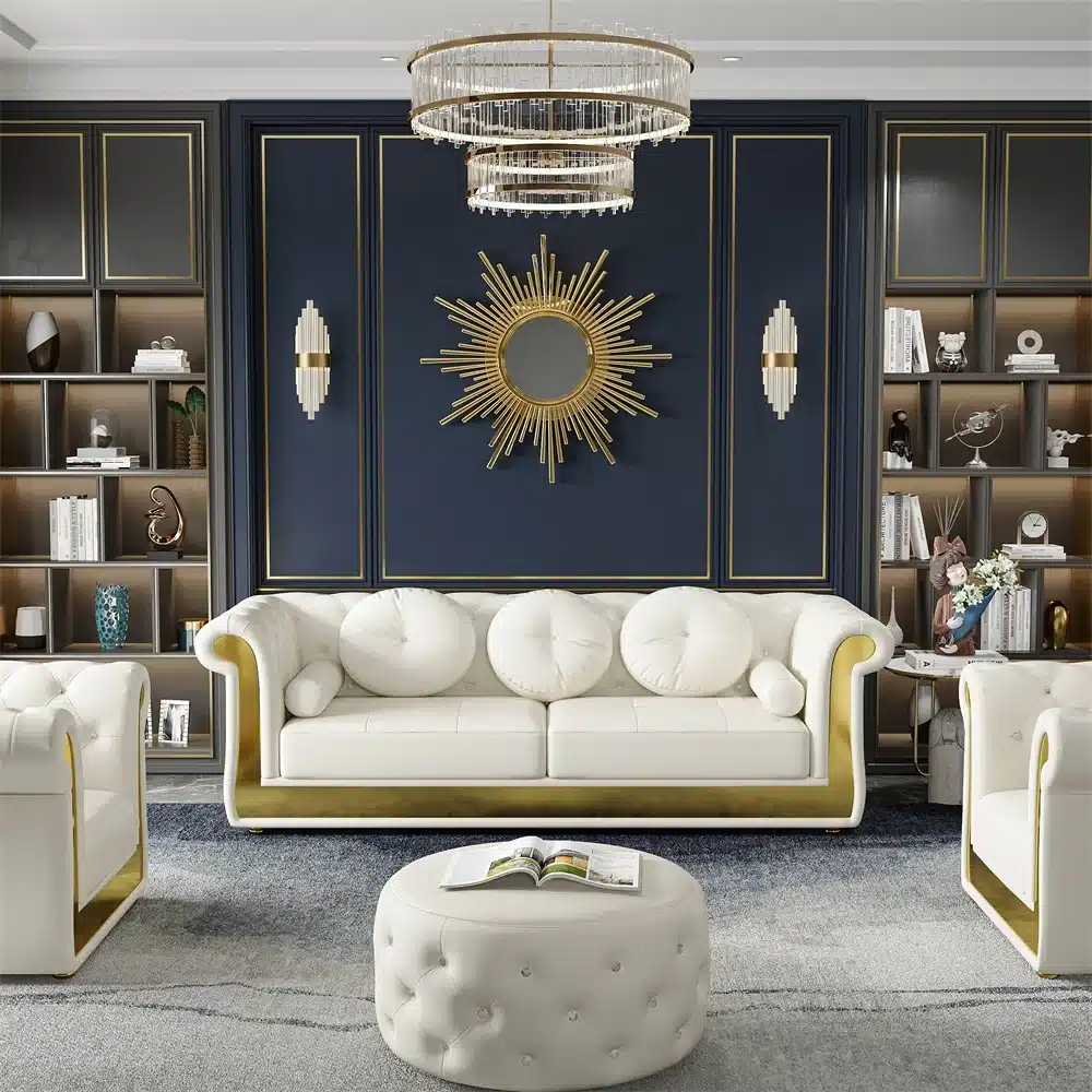 هل يمكن تنسيق الأريكة مع ديكورات حديثة أو كلاسيكية؟ بالتأكيد التصميم الأبيض مع الأرجل الذهبية يجعلها قطعة متعددة الاستخدامات تناسب مختلف أنماط الديكور.