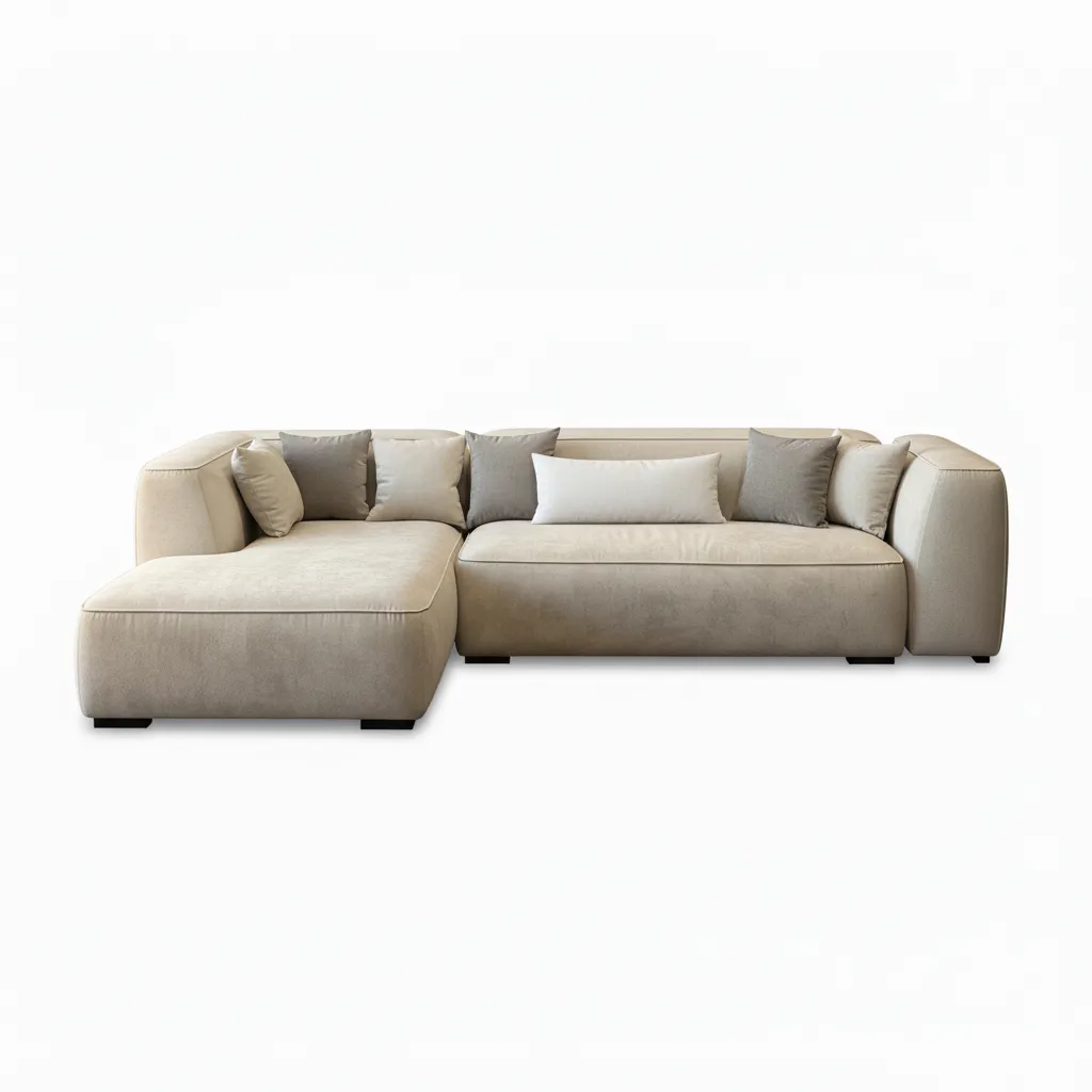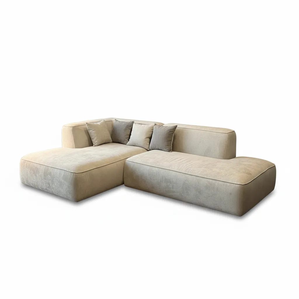 الخامات المستخدمة مختارة بعناية — إسفنج كثيف لتوفير الدعم المثالي، وقماش ناعم بدرجات البيج الفاتح ليعكس الإحساس بالهدوء والدفء.