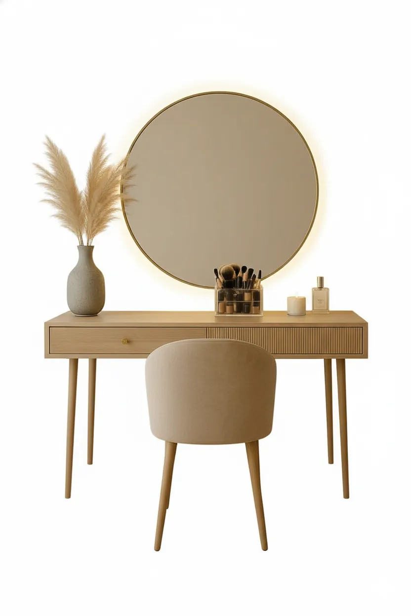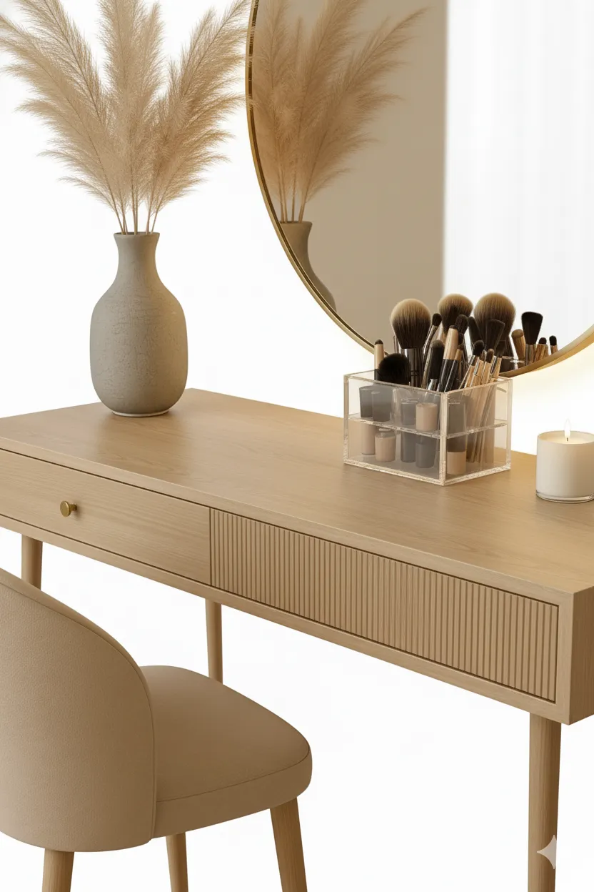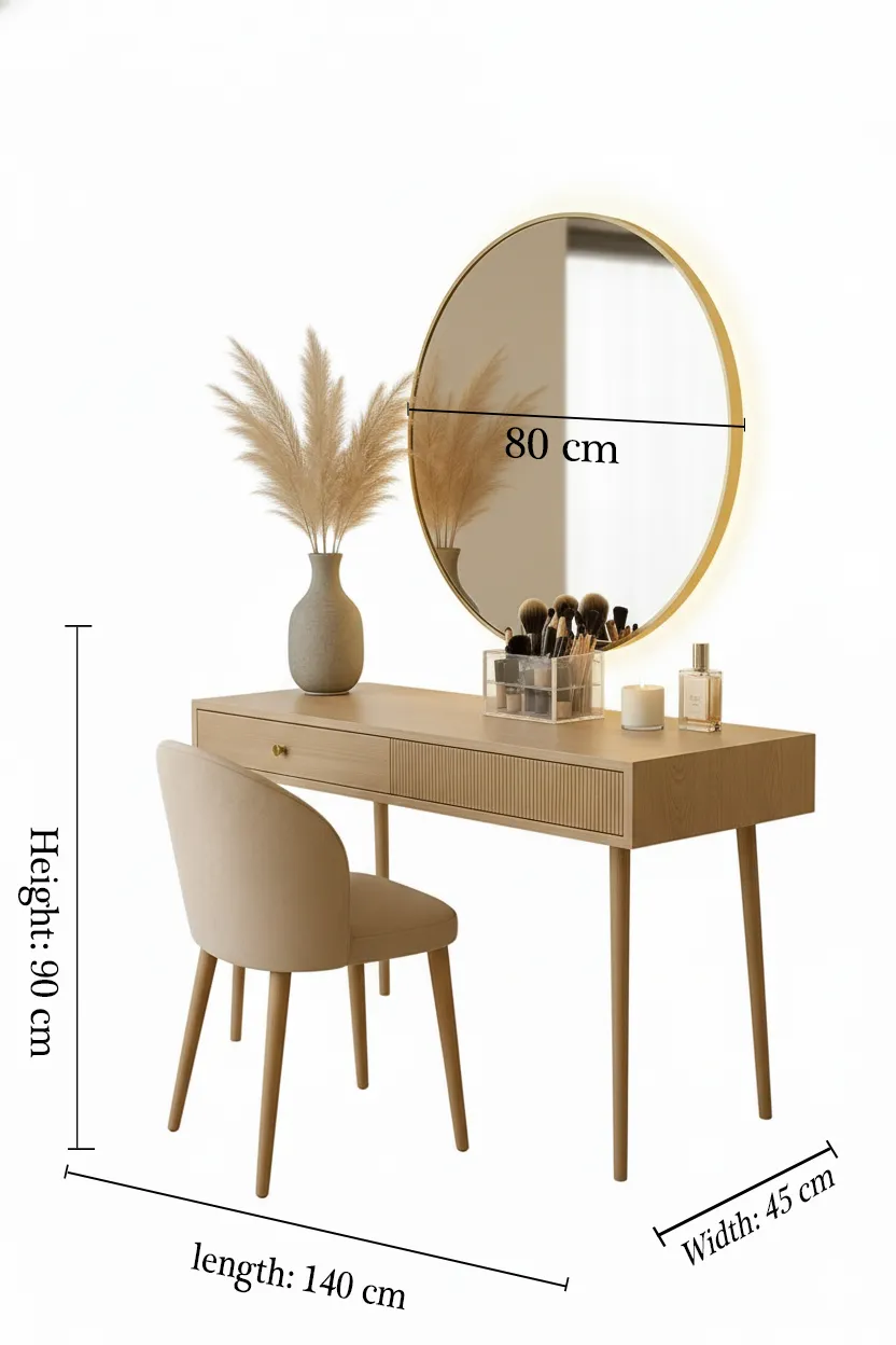 مزودة بدرج بتفاصيل خطوط طولية لإضفاء لمسة جمالية، ومساحة سطح رحبة لتنسيق الإكسسوارات وأدوات التجميل بسهولة. الكرسي مريح بظهر منحني وقاعدة ناعمة لراحة أثناء الجلوس. الخيار الأمثل لعشاق التفاصيل الراقية واللمسة المينيمالية الدافئة.