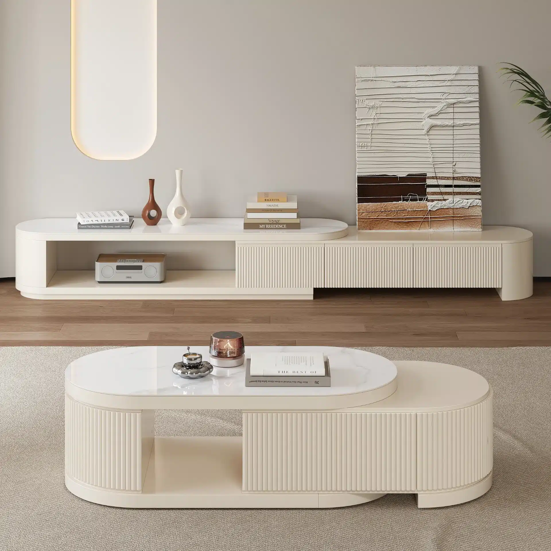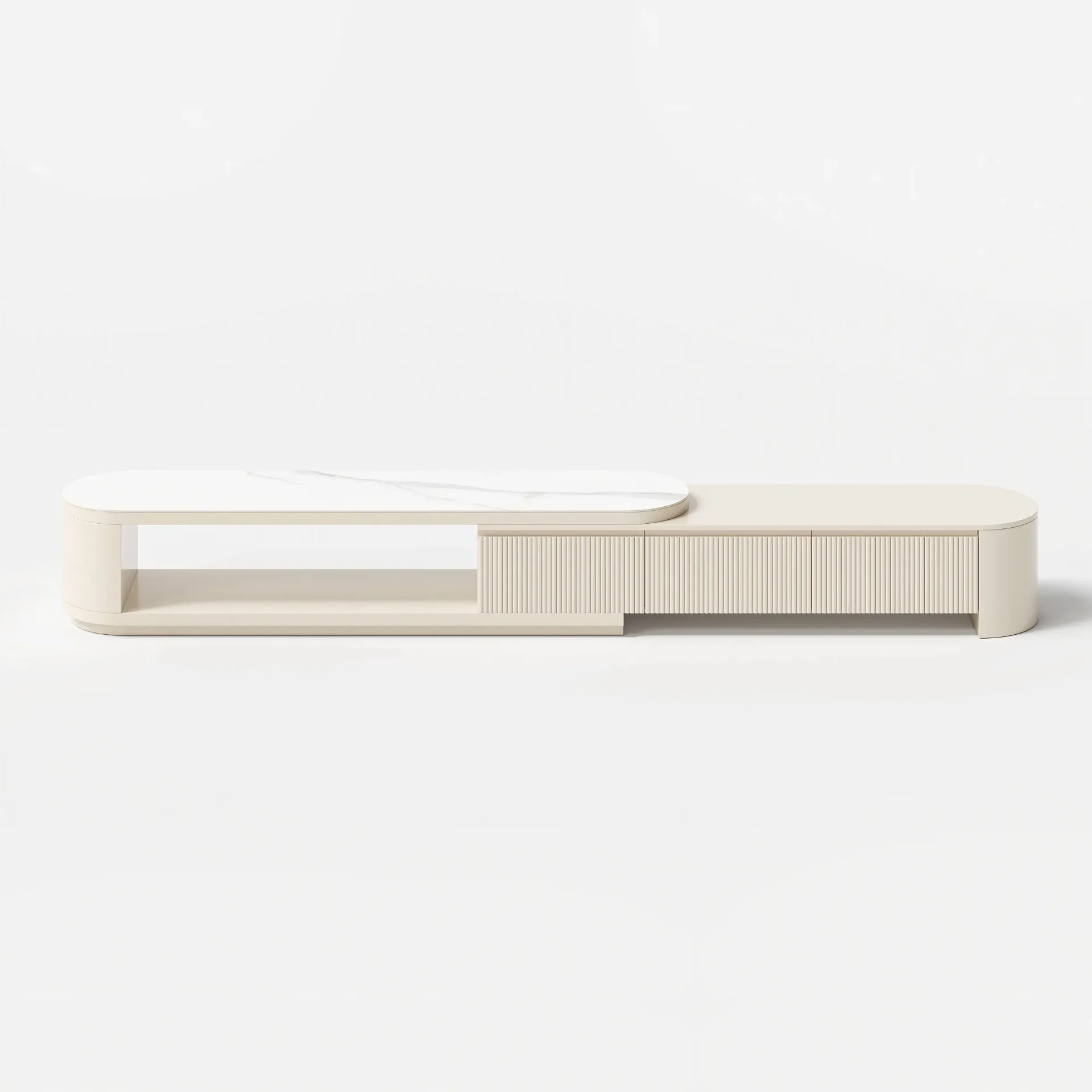 تتميّز وحدة التلفزيون القابلة للتمديد بإمكانية التعديل من 180 إلى 290 سم لتناسب مختلف المساحات، سواء كانت صغيرة أو واسعة. أما طاولة القهوة القابلة للفتح من 120 إلى 170 سم فتوفّر مرونة إضافية للاستخدام اليومي ومساحة تخزين عملية دون التأثير على جمال التصميم.