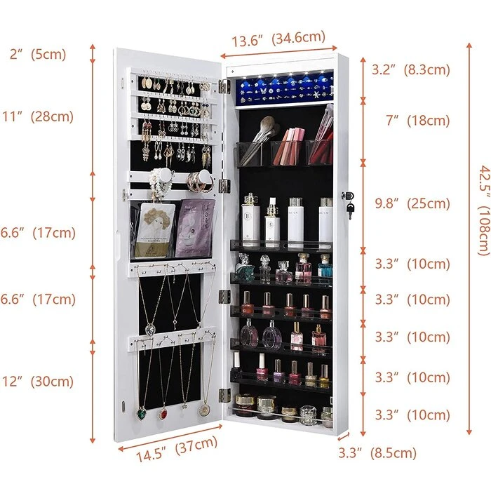 - خزانة متعددة الاستخدامات: تجمع بين مرآة طويلة مع مساحة تخزين كبيرة لتنظيم المجوهرات، الاكسسوارات، العطور والمزيد.
