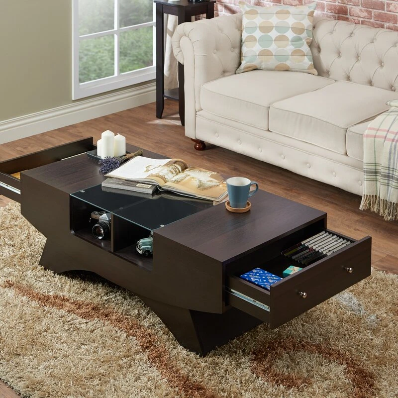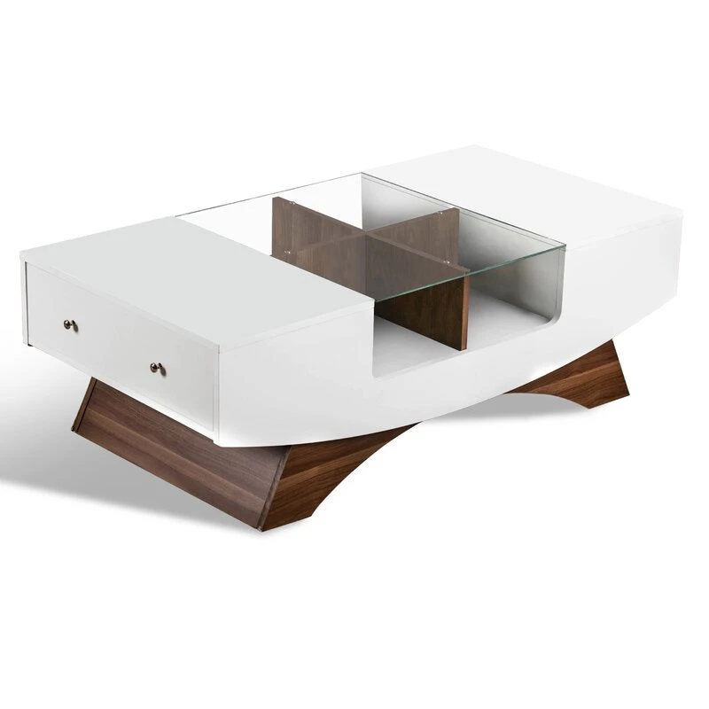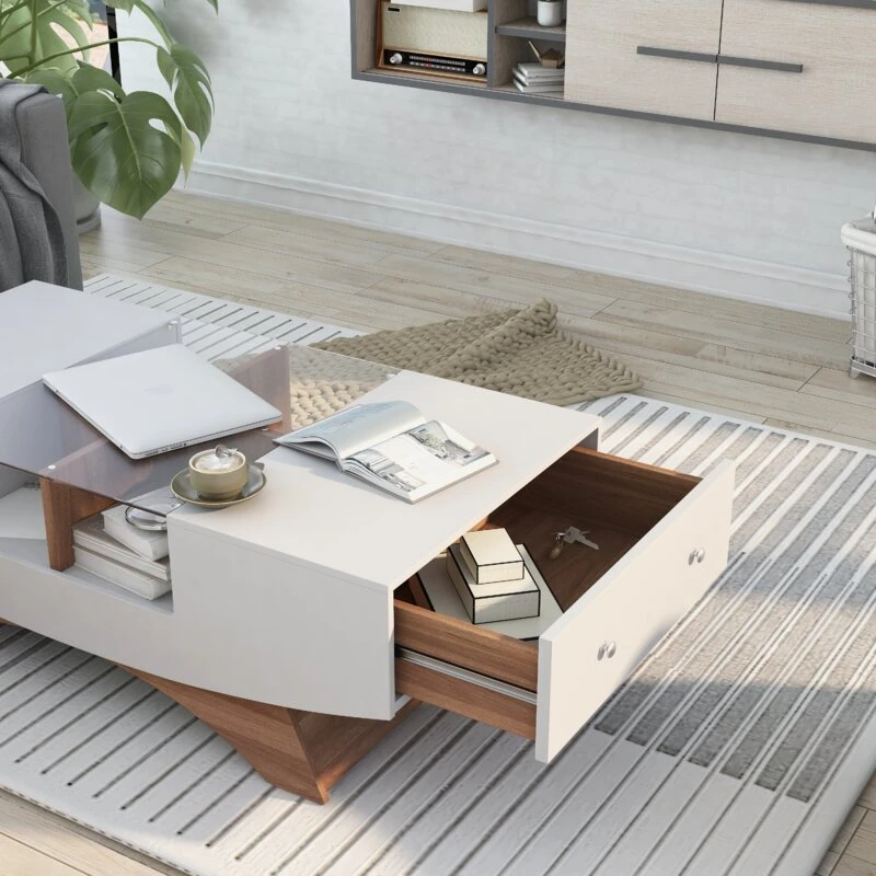 - مساحة تخزين إضافية:تحتوي الطاولة على أربعة أرفف مقسمة موضوعة خلف زجاج مقسّى، مما يوفر مساحة تخزين كبيرة لتنظيم أجهزة التحكم عن بُعد، ألعاب الطاولة، وغيرها من الأغراض الصغيرة. بالإضافة إلى درجين جانبيين لتخزين البطاريات، الدفاتر، أو أي مقتنيات أخرى.