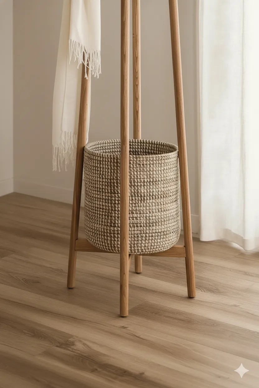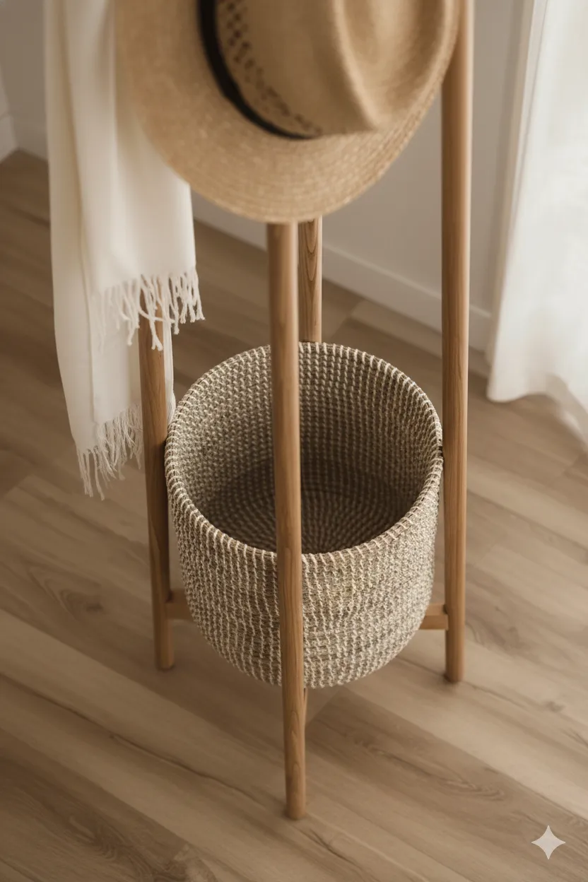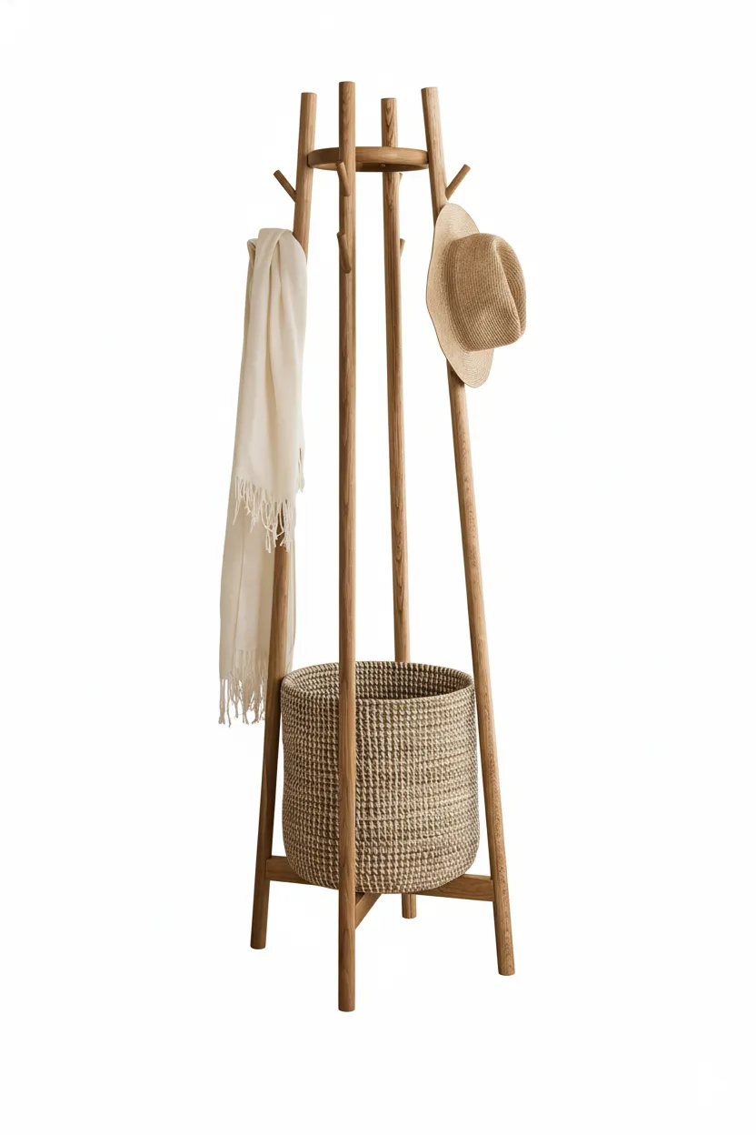 تصميم رأسي انسيابي مزود بخطافات لتعليق الملابس والقبعات، مع قاعدة منسوجة ديكورية مخصصة لحفظ البطاطين أو الوسائد أو الإكسسوارات المنزلية.