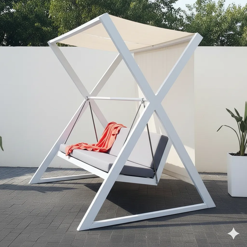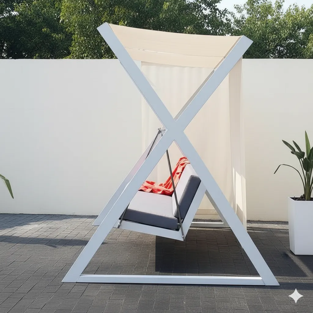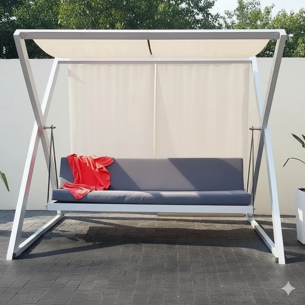 المظلة العلوية توفر حماية من أشعة الشمس، بينما يمنحها التصميم الهندسي شكلًا أنيقًا وثابتًا في الوقت نفسه.