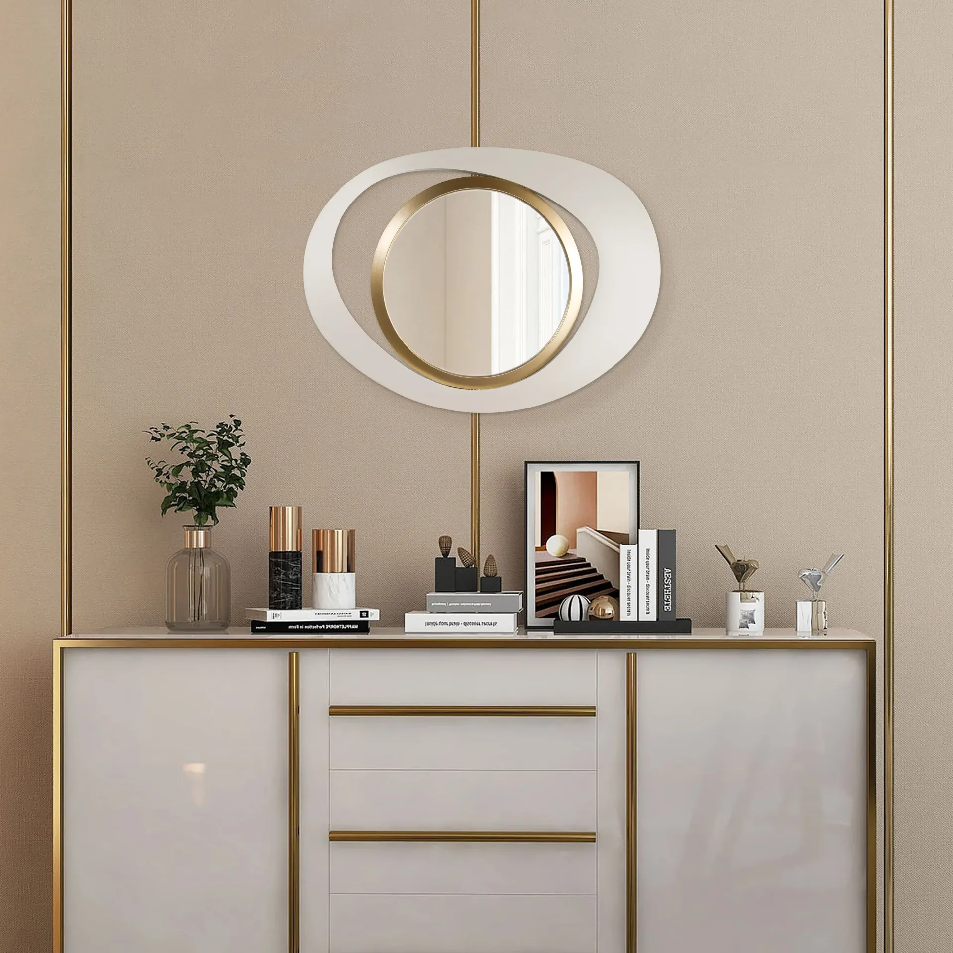 أضف لمسة من الأناقة العصرية إلى منزلك مع مرآة الحائط أوربت لوكس. تتميز هذه المرآة بإطار غير متماثل يحيط بمرآة دائرية مذهلة مع حافة ذهبية تبرز في مركزها، مما يمنحها تصميمًا يجمع بين الحداثة والطابع الفني الفريد. بفضل شكلها النحتي، تضيف هذه القطعة عمقًا وبعدًا بصريًا، مما يجعلها الاختيار المثالي لغرف المعيشة، المداخل، أو غرف النوم. مصنوعة من مواد عالية الجودة، توفر هذه المرآة لمسة راقية تعزز الإحساس بالمساحة والأناقة في أي مكان توضع فيه.