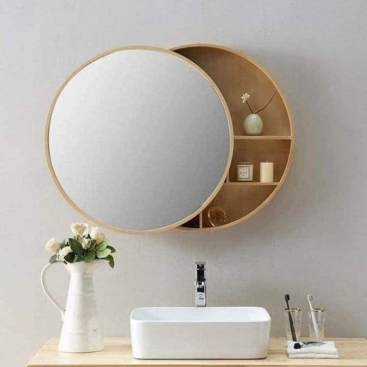 ما هي المواد المستخدمة في تصنيع المرآة؟ تم تصنيع المرآة من الأبلكاش و الكونتر الطبيعي، مما يجعلها متينة ومقاومة للرطوبة في بيئة الحمام.