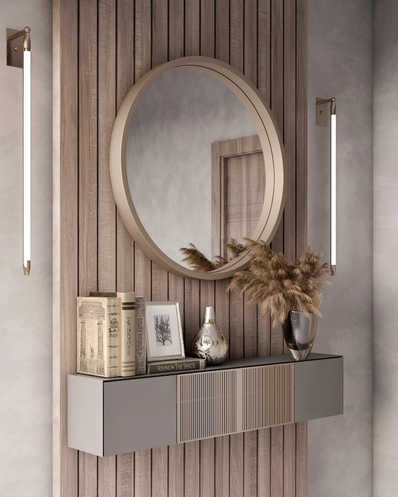 أورورا مراية دائرية خشب طبيعي تجمع بين البساطة والأناقة في تصميم واحد، وهي اختيار مثالي لمن يرغبون في إضافة لمسة من الفخامة إلى أي مساحة. تتميز المرآة بإطار من الخشب الطبيعي الذي يوفر لها قوة ومتانة، مما يجعلها خيارًا رائعًا للاستخدام اليومي في الحمام أو مدخل المنزل.
