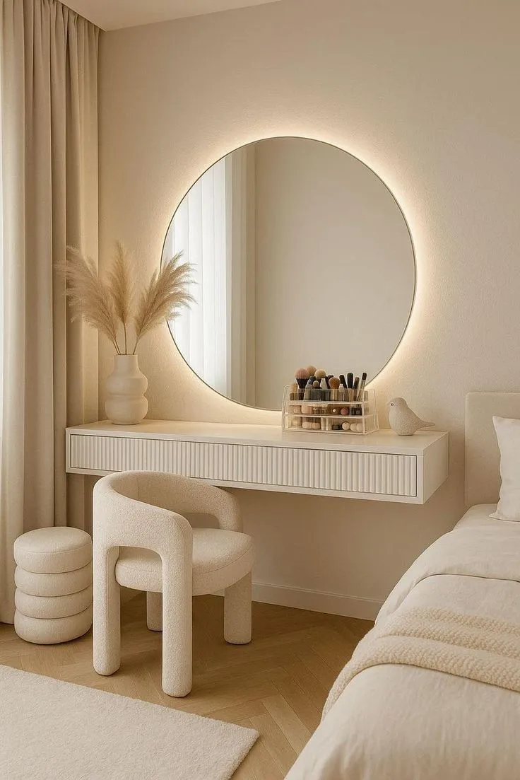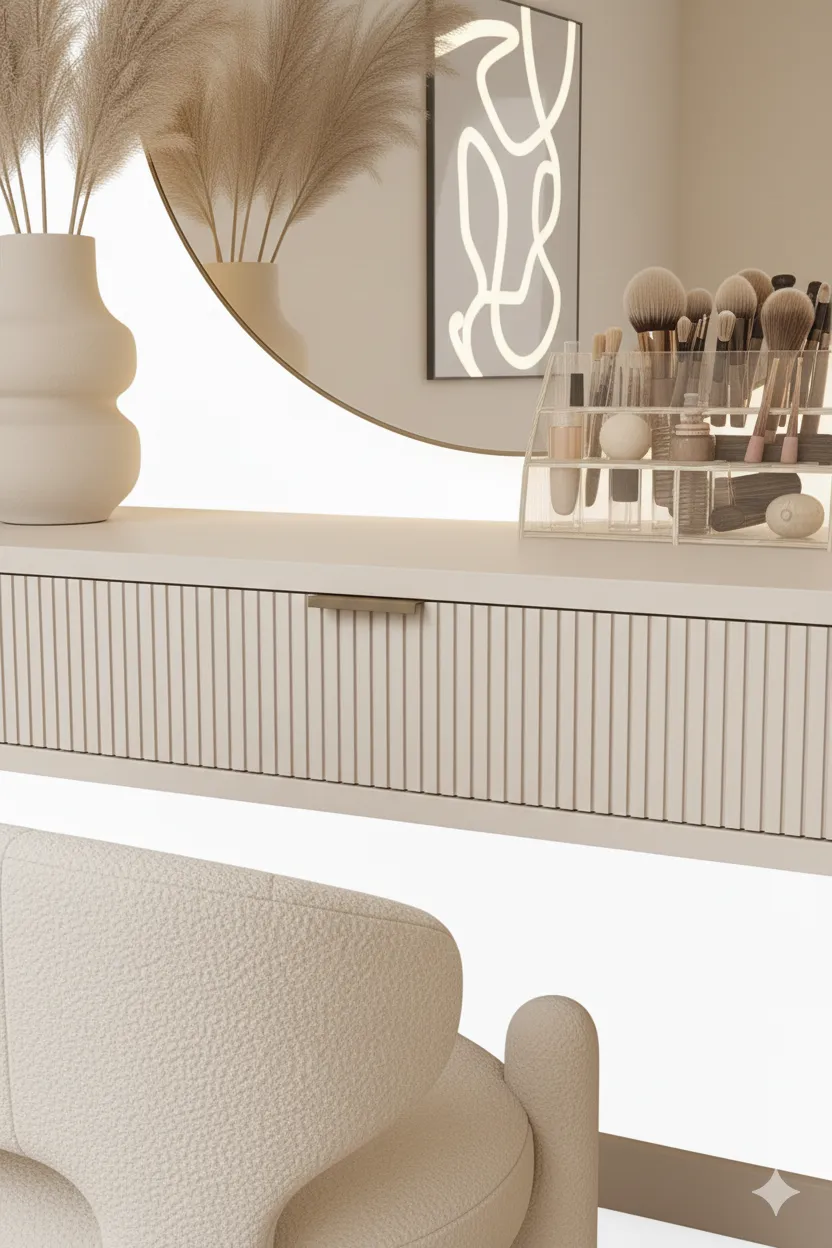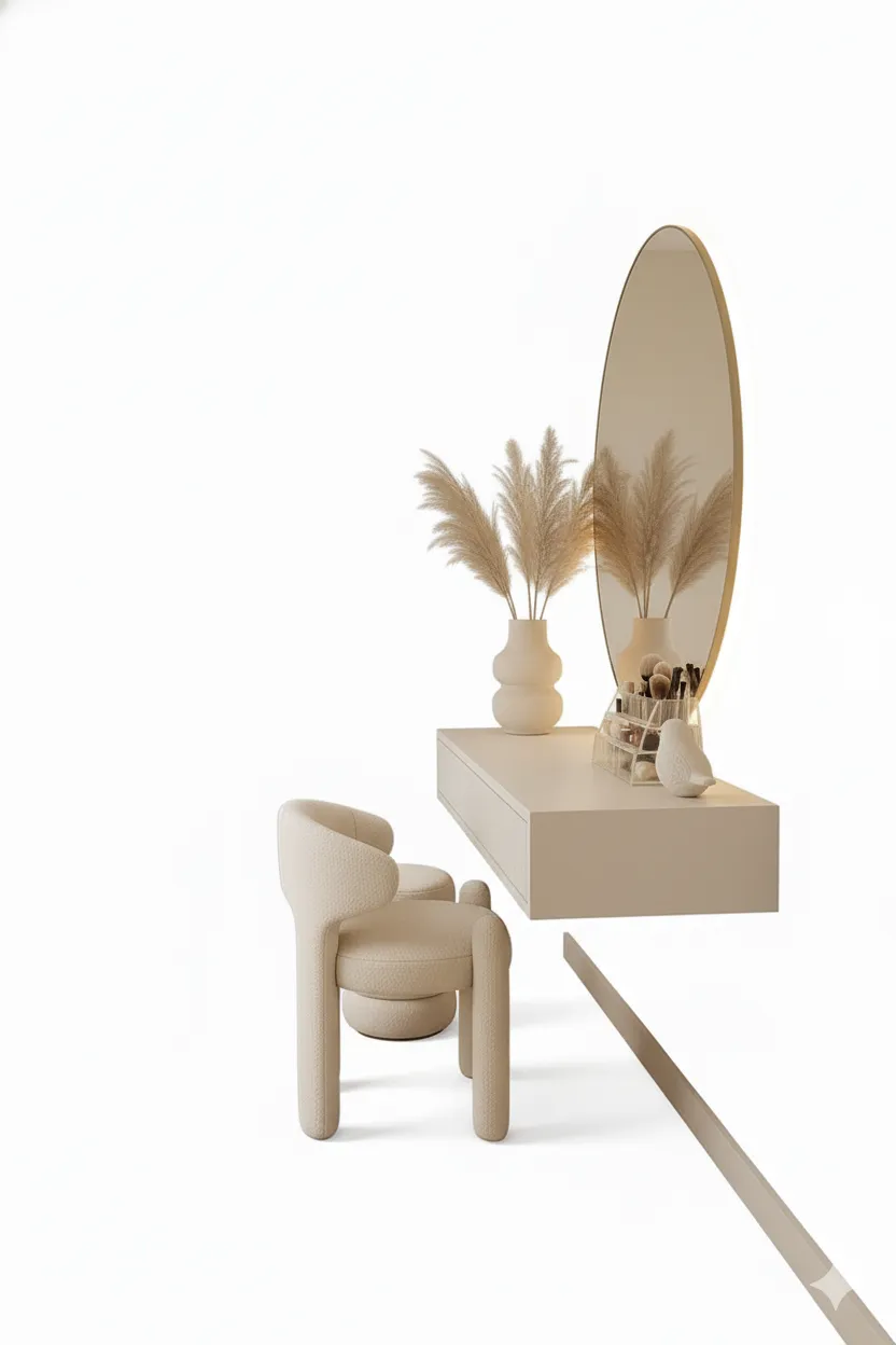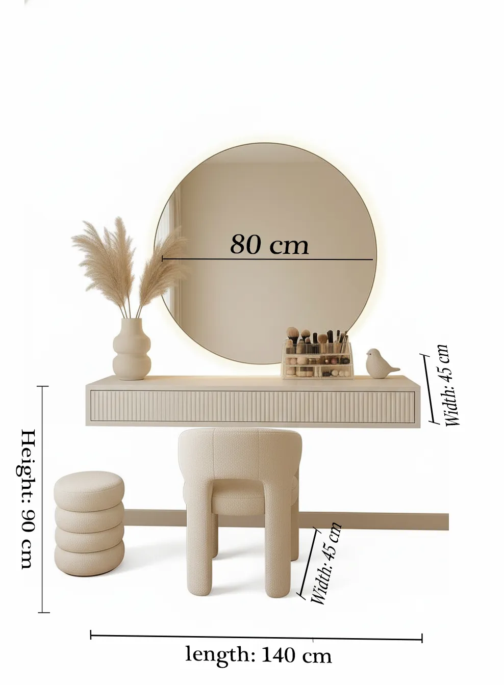 مـيــنـــرفـــا تسريحة معلّقة بتصميم هادئ ولمسة بيچ مطفية، بتصميم أنيق يوفر إحساسًا بالاتساع داخل الغرفة. تأتي بلون بيچ مطفي متناغم مع مرآة مضاءة خلفيًا تمنح إضاءة ناعمة مثالية لوضع المكياج والعناية اليومية. سطحها العلوي عملي لحفظ المستلزمات، ويمكن دمجها بسهولة في غرف النوم الحديثة.
