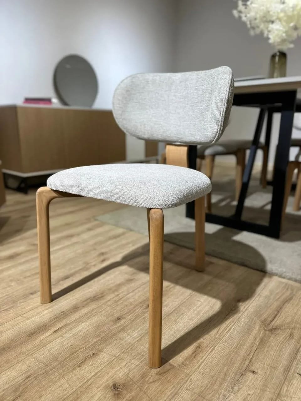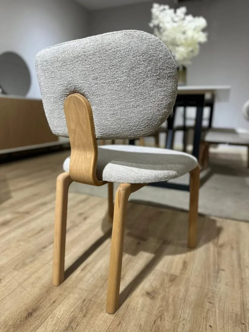 الكراسي بتصميم مريح من الخشب الطبيعي مع تنجيد قماشي ناعم بلون رمادي فاتح يعزز من فخامة المكان.