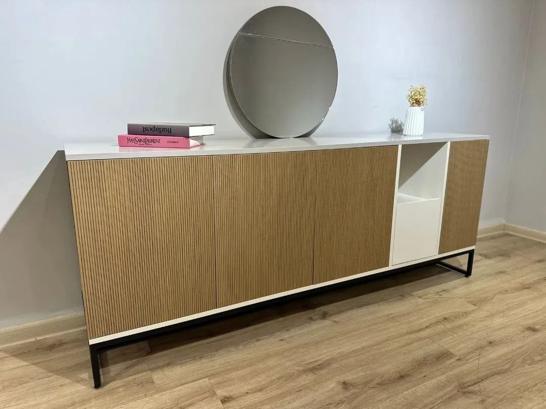 الطقم مزود ببوفيه عملي بتصميم بسيط ومساحات تخزين واسعة، مما يجعل السفرة مثالية للاستخدام اليومي أو للضيافة الراقية.