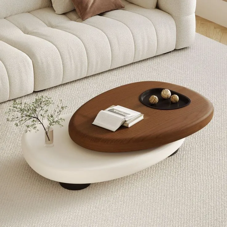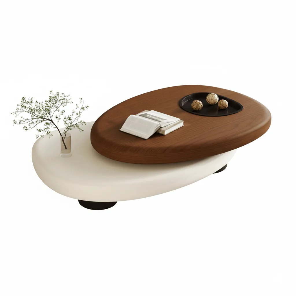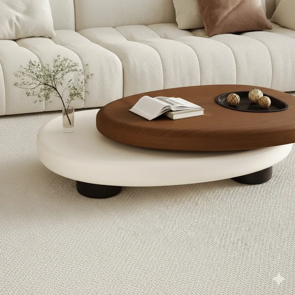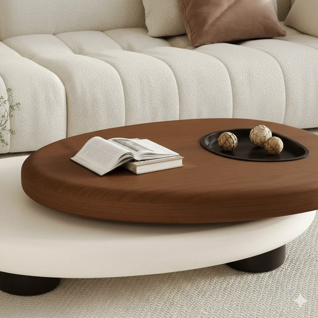 طاولة قهوة عصرية بتصميم دائري مستوحى من نعومة ألوان البندق، تجمع بين سطح خشبي أنيق وقاعدة انسيابية ثابتة.الأبعاد: الطول 110 سم × العرض 60 سم × الارتفاع 35 سم.