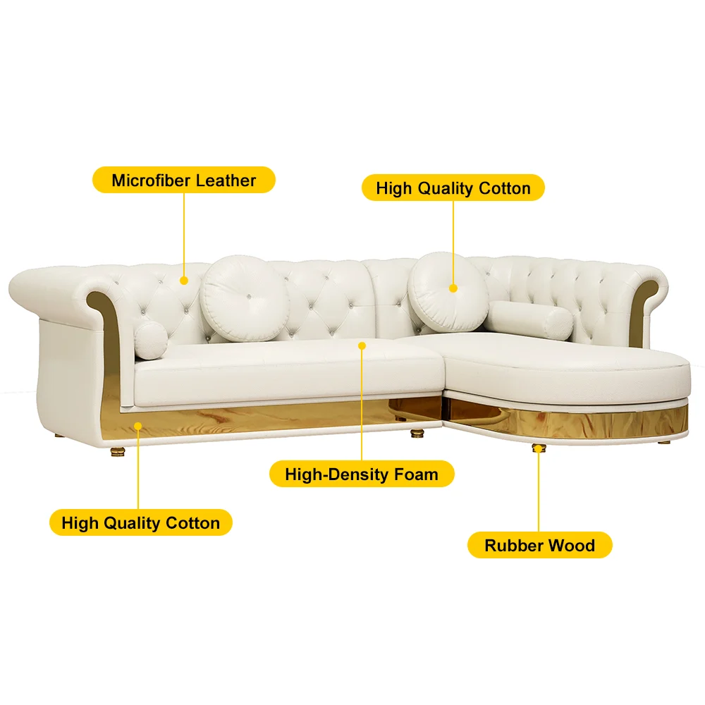 مميزات ڤالينسيا أريكة مقسّمة مُبطّنة من الخشب الطبيعي بلمسة من الأستانلس الذهبي مع كرسي جانبي ووحدة استرخاء
