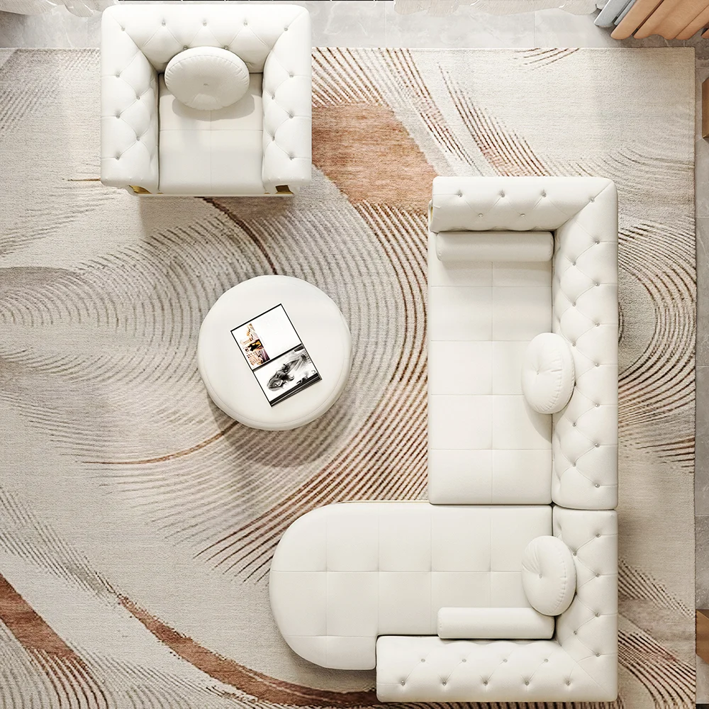 - أريكة مقسمة بتصميم مبطّن مع كرسي جانبي ووحدة استرخاء لمجموعة متكاملة.
