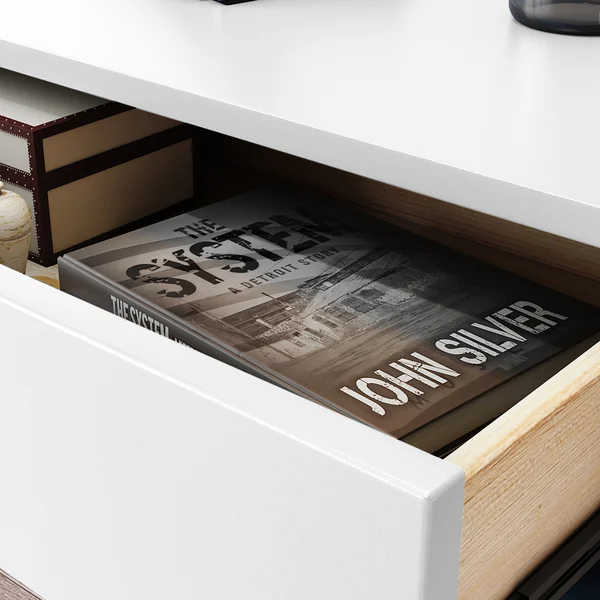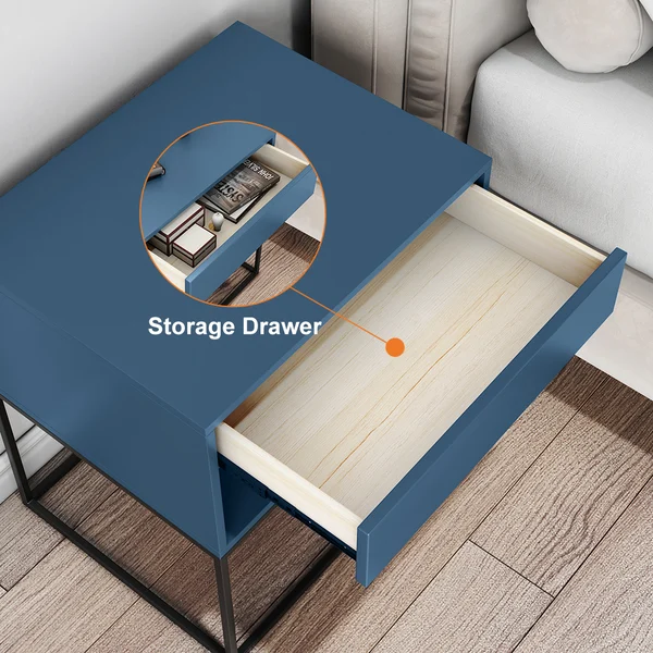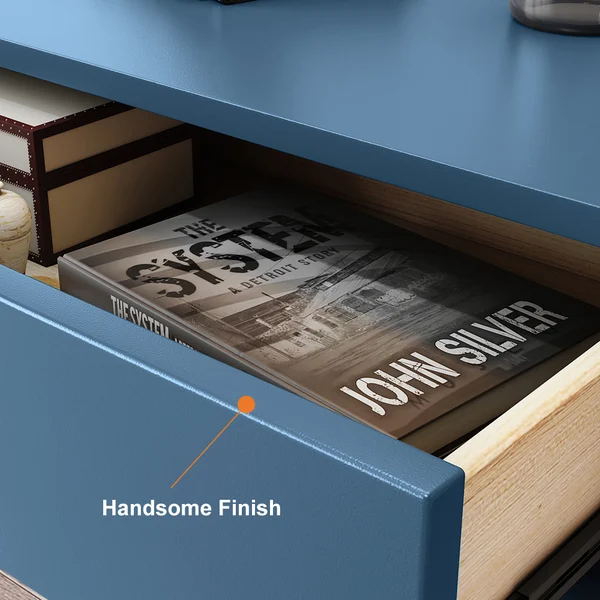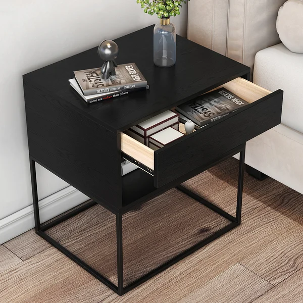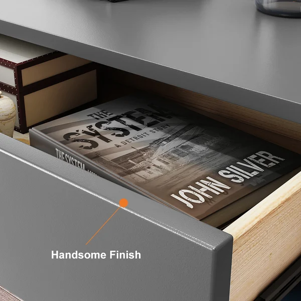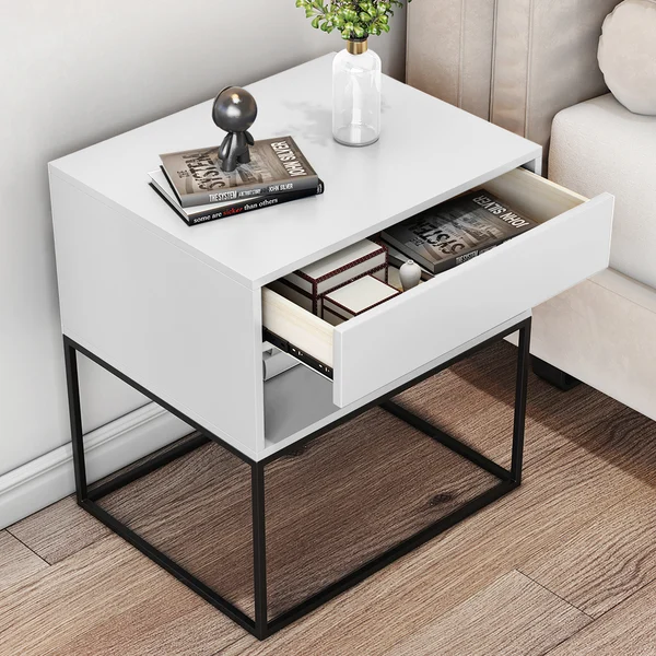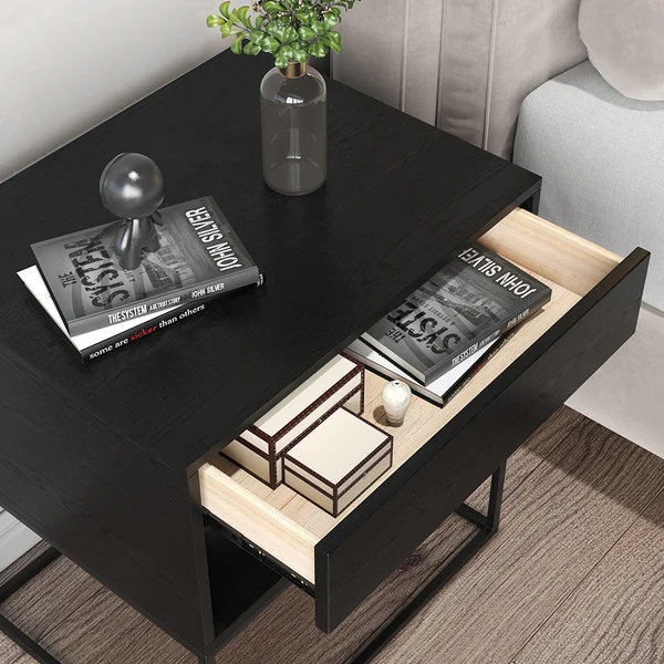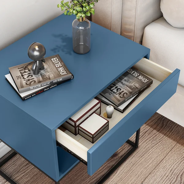 1. درج منزلق ورف مفتوح: توفر لك الطاولة درجًا منزلقًا يسهل الوصول إلى محتوياته، بالإضافة إلى رف مفتوح يسمح بتخزين أو عرض الكتب، المستحضرات أو الأجهزة الإلكترونية.