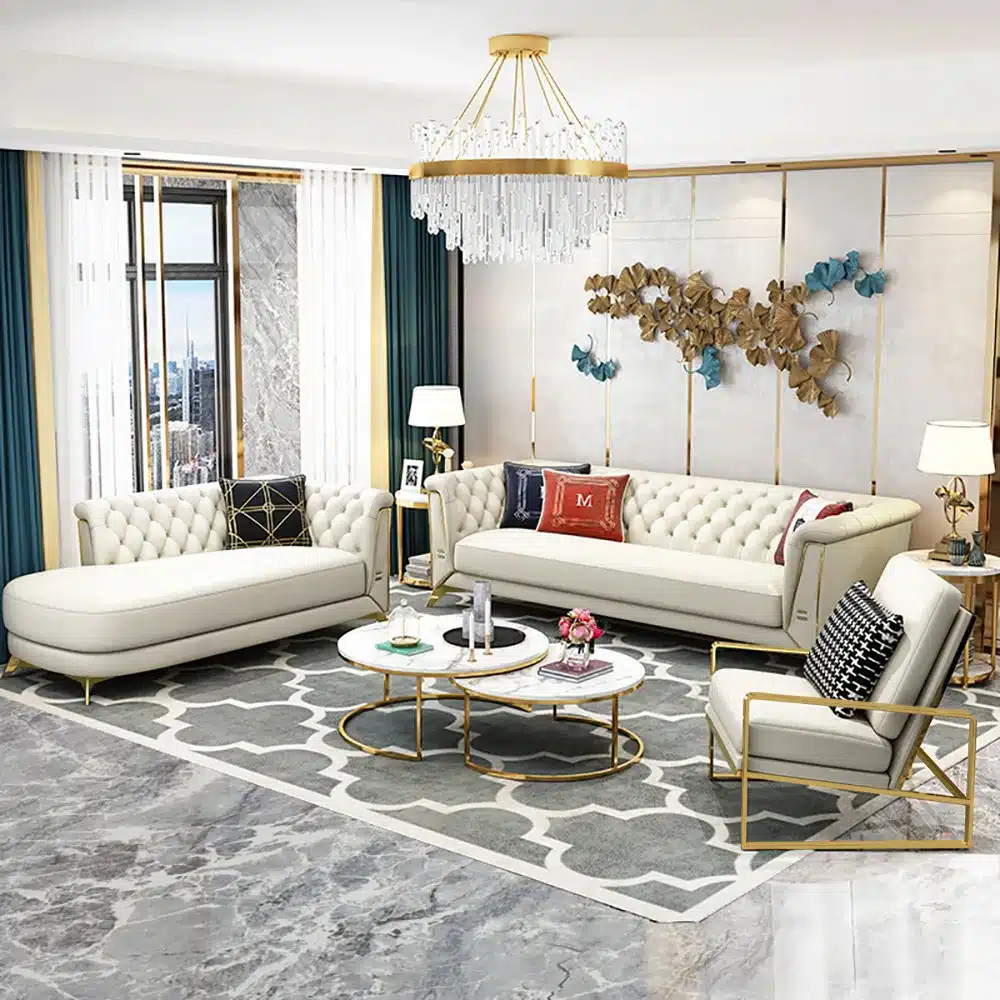 توفّر الوسائد الفاخرة المبطنّة تجربة جلوس مريحة تجمع بين الدعم والنعومة، بينما تضيف التفاصيل المزخرفة والتشطيب الذهبي من الاستانلس المقاوم للصدأ لمسة من الرقي الملكي. بفضل توازنه بين الفخامة والراحة، يتناغم طقم ڤرساي بسهولة مع الديكورات العصرية والكلاسيكية، ليحوّل أي مساحة معيشة إلى مشهد راقٍ يعكس ذوقًا رفيعًا.